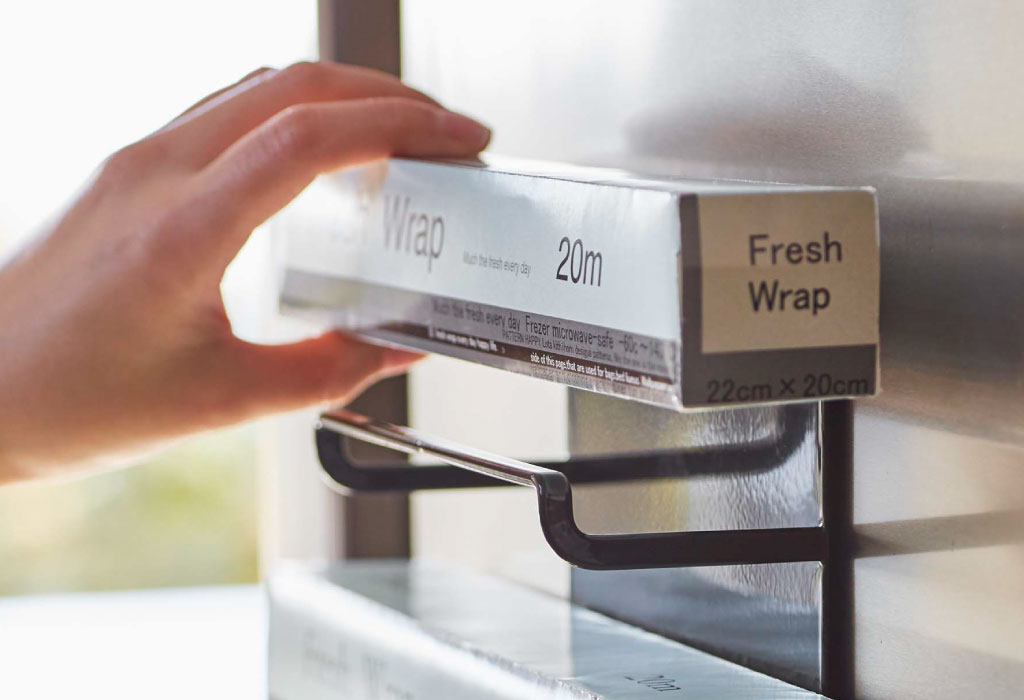 ホルダーの奥行きは約7cmとスリムなので、冷蔵庫横などのちょっとした空間に設置可能。デッドスペースを活かして収納できるのは、嬉しいポイントですね。ラップを上から置くだけのオープンタイプなので、収納時はもちろん、使いたい時にもさっと手に取れて便利です。