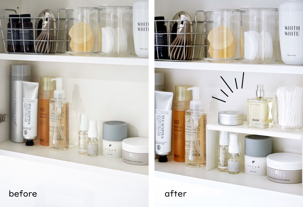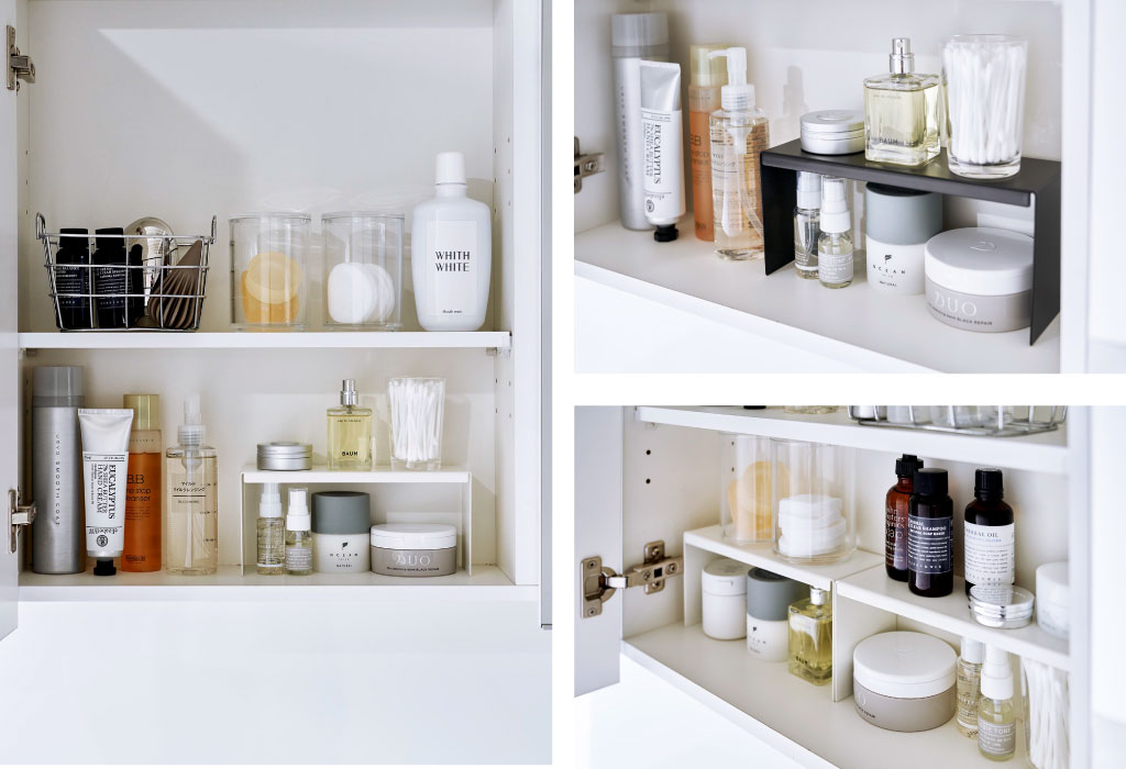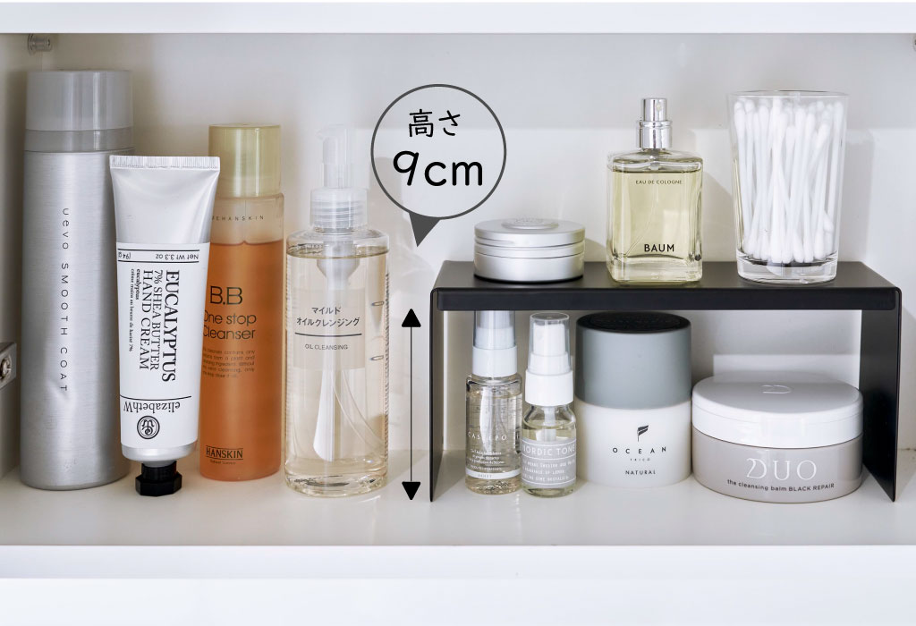 背の高いアイテムや背の低いアイテムなど、高さの違いで生まれたスペースを利用することで収納力アップに繋がります。背の低いアイテムは、コの字ラックの高さ(内寸)が9cm以下のアイテムを収納するだけで上下のスペースを有効に使うことができます。