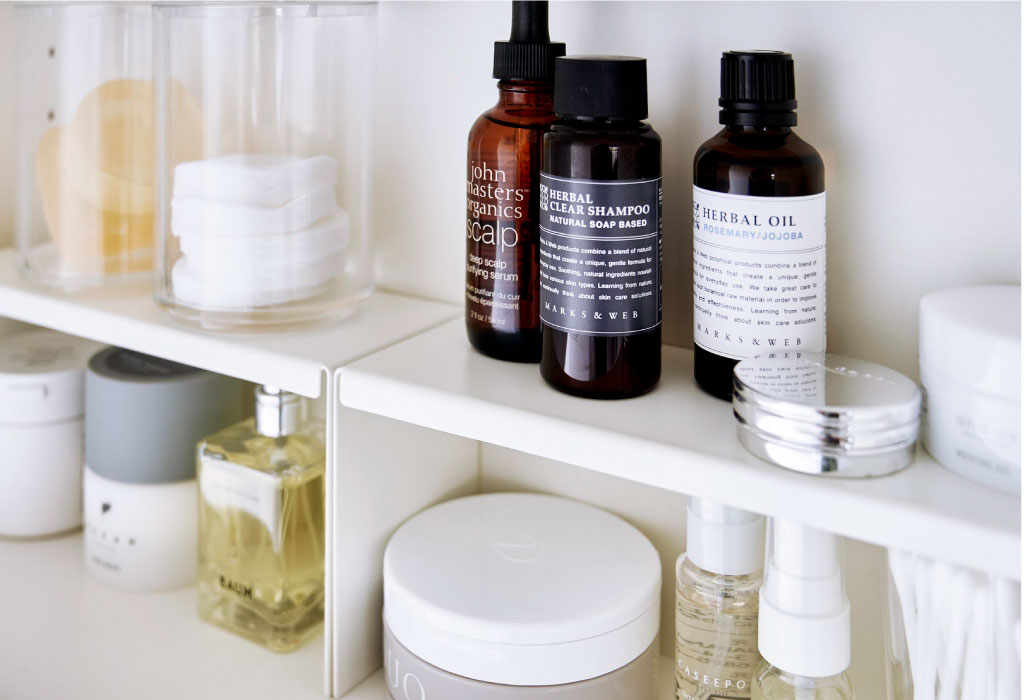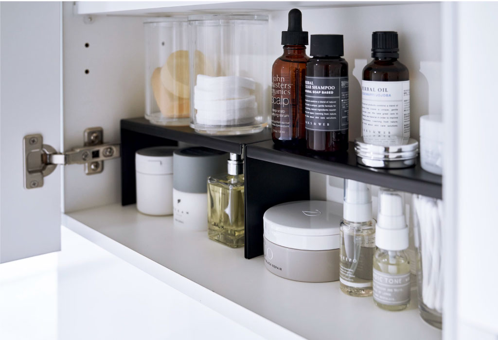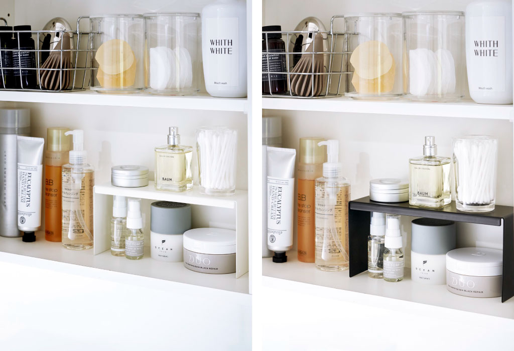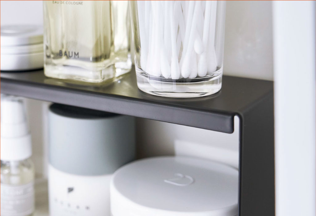 細々したアイテムが混在する洗面所。新たな収納スペースとして洗面鏡の中を見直してみませんか。背の高いアイテムや背の低いアイテムなど、高さの違いで生まれたデッドスペースにコの字ラックを置くだけで、上下のスペースを有効に使うことができます。本品は2個入りなので横に並べたり、1コずつ使用したりとアイディア次第で洗面鏡以外の場所にもお使いいただけます。