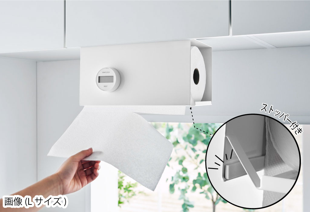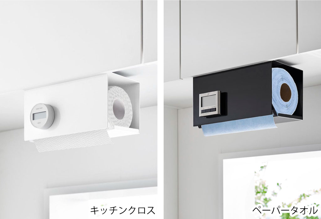 衛生面も安心のキッチンペーパーを覆うカバー付き。戸棚下のデッドスペースを活用するだけでなく、ほこりや油はねからもしっかり防いでくれるキッチンペーパーホルダーです。