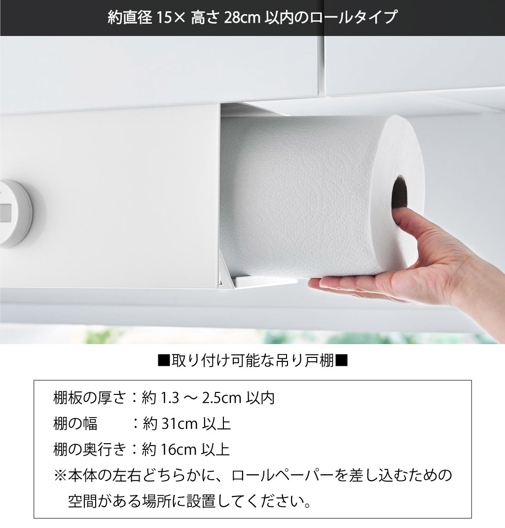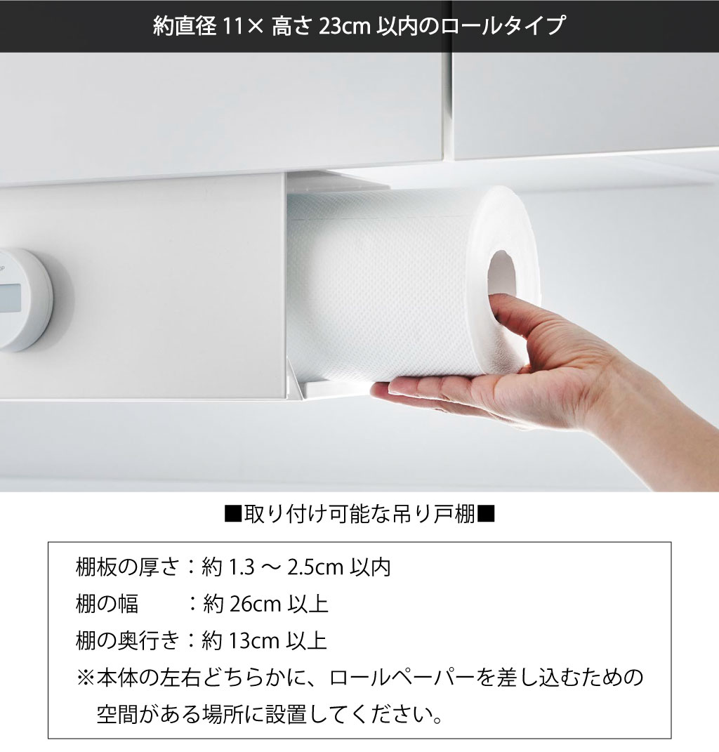 | 対応サイズ | 約直径11×高さ23cm以内のロールタイプのキッチンペーパー・ペーパータオル・キッチンクロス |