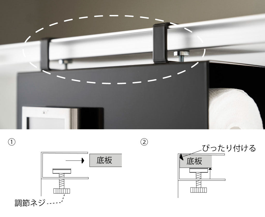 2.本体を水平・垂直に取り付け、底板を挟み込むように調節ネジを締めて固定してください。