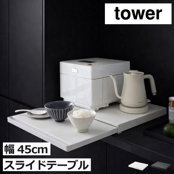 キッチン家電の下に置くだけでスライドテーブルや収納を増やせる、towerシリーズのおしゃれな家電下収納ラックです。電子レンジ・トースター・炊飯器・ケトルなどのキッチン家電を載せてご使用いただけます。家電下スライドテーブルは必要な時にサッと引き出して、料理の一時置きや調理スペースとして活躍。最大約25cm引き出せるので、家電下スライドテーブルの上で広々と作業できます。食事にラップをして電子レンジへ入れる時、ごはんを盛り付ける時などに活躍する家電下スライドテーブルです。収納力抜群の引き出しには、キッチン小物をまとめて収納できます。目隠しして収納することで、生活感が出がちなキッチンまわりがすっきり整います。スチール製の頑丈な家電下収納ラックなので、重たいキッチン家電も安心して載せることができます。家電下収納ラックは「テーブル」「テーブル+引き出し」「2段」の3タイプ。「テーブル」タイプはスリムであまり高さを出さないのが特徴。炊飯器を上に載せる場合でも、ご飯を盛り付けやすいので便利です。「テーブル+引き出し」タイプは、作業台と収納、どちらも増やせるのが魅力。家電下スライドテーブルを使って調理をスムーズにしつつ、キッチン小物を使いたいときにはサッと取り出せて、作業効率アップ。「テーブル」タイプと「テーブル+引き出し」タイプの幅は、コンパクトな「W45」とワイドな「W80」をご用意しました。「2段」タイプはキッチン家電を省スペースにまとめて設置したい方におすすめです。設置場所や用途に合わせて、「2段」タイプはテーブル付きのものと引き出し付きのものからお選びいただけます。おしゃれな家電下収納ラックで、限られたキッチンスペースを賢く広げて、毎日の家事をよりスムーズで心地よく。