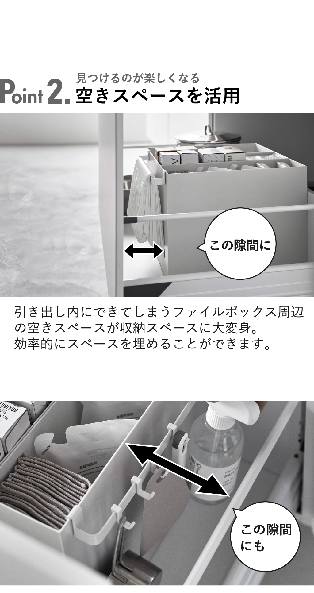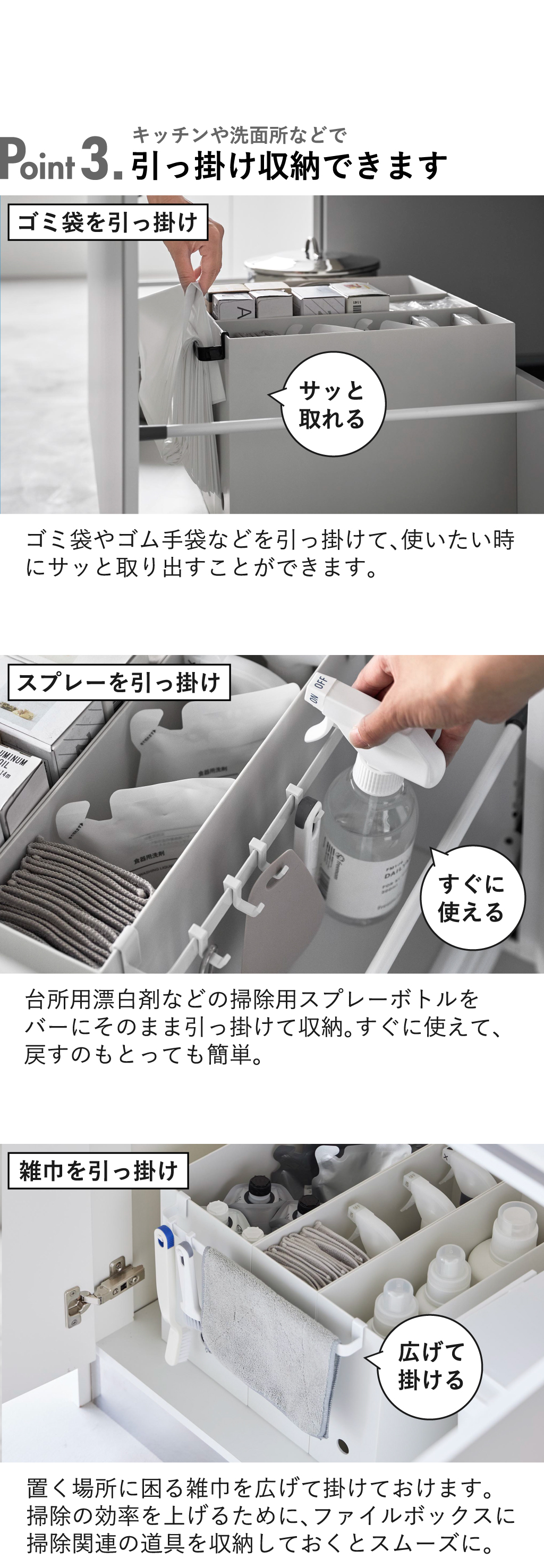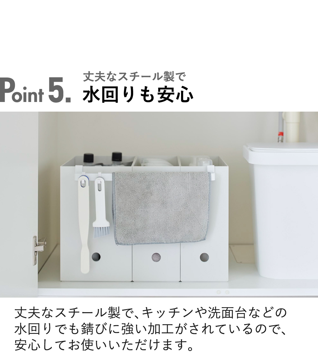 整理整頓といえばファイルボックス。そんな引き出し内のファイルボックスの周辺に空きスペースはありませんか。 お手持ちのファイルボックスにバーを取り付けるだけで、隙間収納としてさらに空間を有効活用することができます。 バーにはゴミ袋やスプレーを引っ掛けておいたり、付属のフックで吊り下げ収納もできます。 見落としがちな隙間収納を制して家事効率をもっとアップさせることができるバーです。