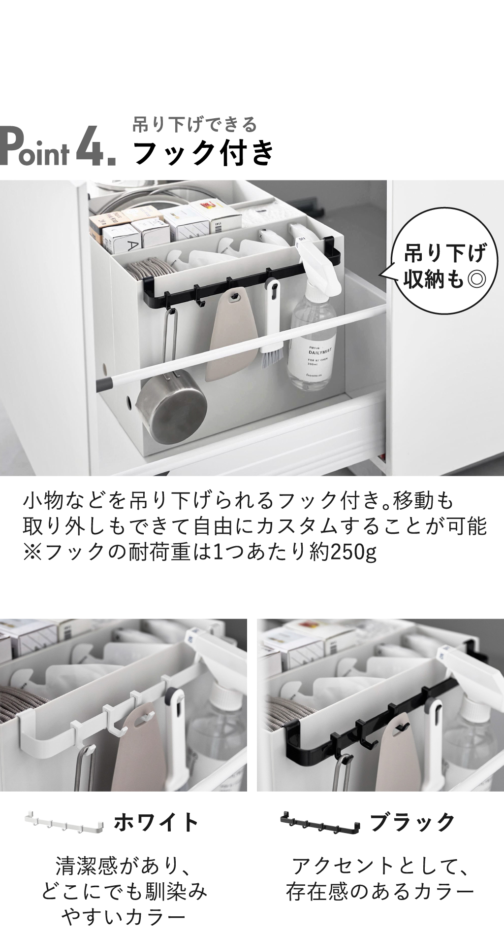 | 耐荷重 | 本体:約1kg フック1つあたり:約250g ※ファイルボックス内に約500g以上の収納が必要 |