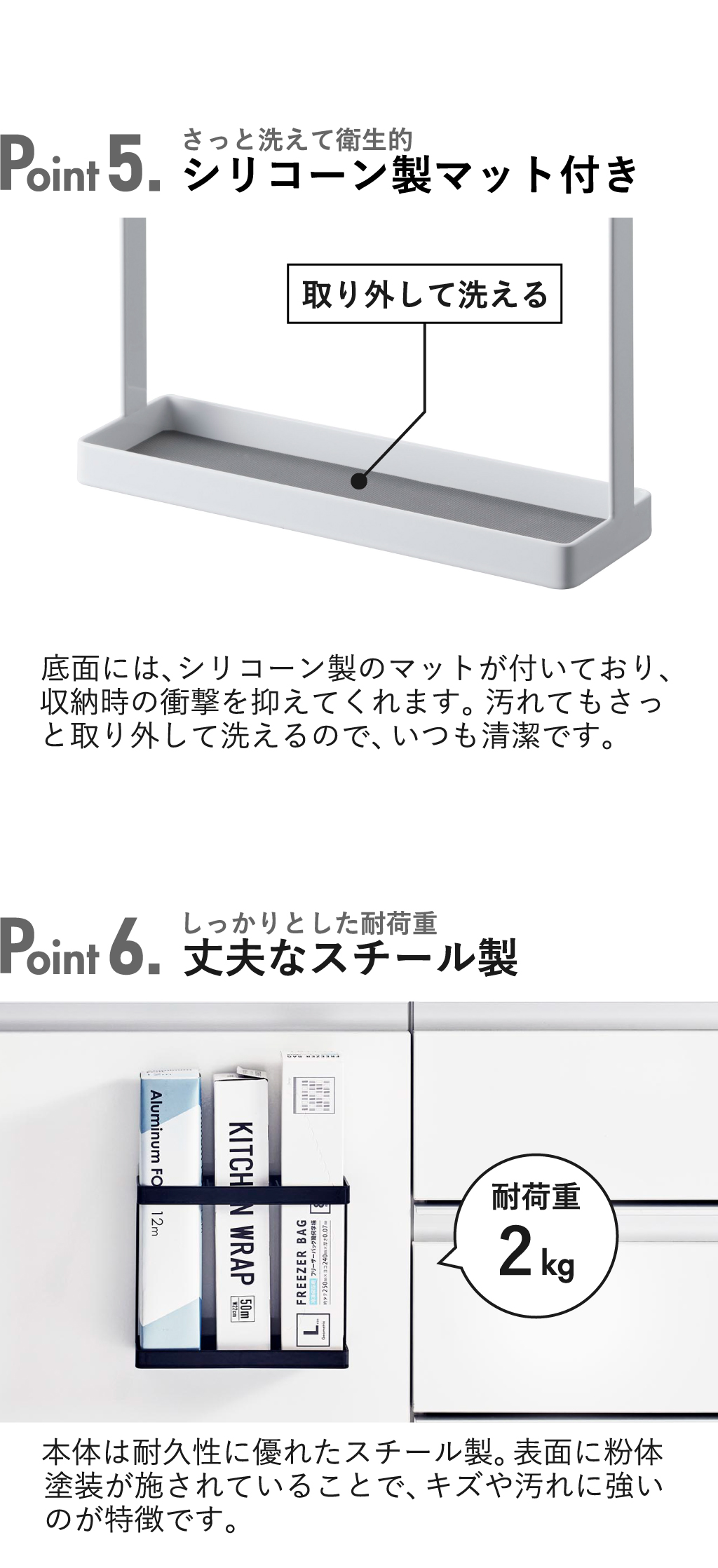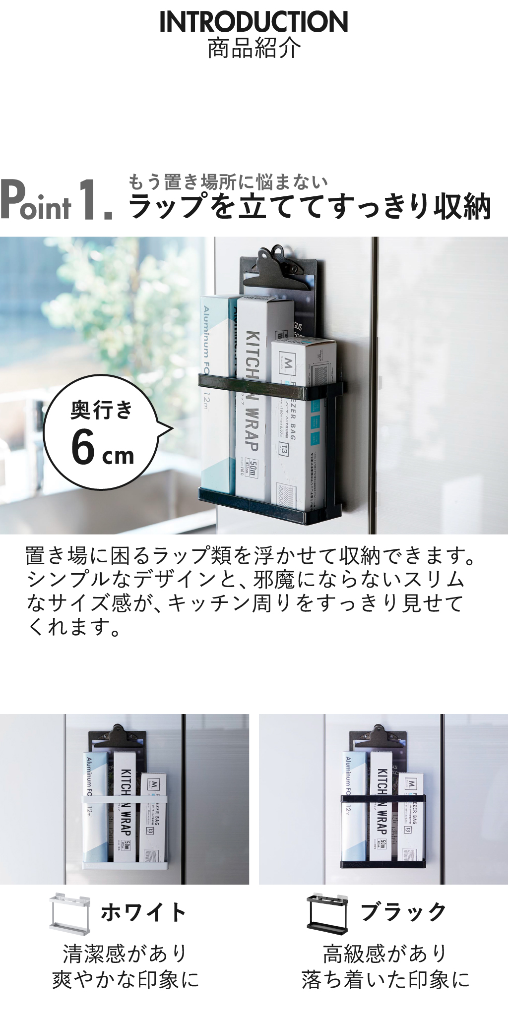 置き場に困るラップやアルミホイルを、浮かせてすっきり収納できるラップホルダーです。シンプルなデザインとスリムなサイズ感が、キッチン周りをすっきり見せてくれます。設置方法には、光沢のある壁面にぴたっと設置できるフィルムフックを採用。マグネットのつかない冷蔵庫のガラス扉やキッチンパネルなどに、手軽に設置可能。最大3本までのラップ類を収納できます。仕切り付きで倒れないのも◎。ラップホルダー収納部の奥には隙間があり、A5サイズまでのレシピ本などを収納できて便利。底面にはシリコーン製のマットが付いており、収納時の衝撃を抑えてくれます。ラップホルダー本体は丈夫なスチール製で、キズや汚れに強いのが特徴です。耐荷重は約2kgとしっかりしているので、安心して収納できます。ラップホルダーの色は、ホワイトとブラックの2色からお選びいただけます。ポイント利用。