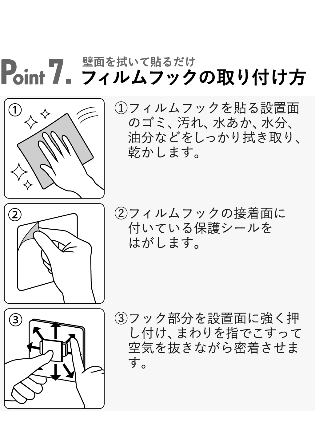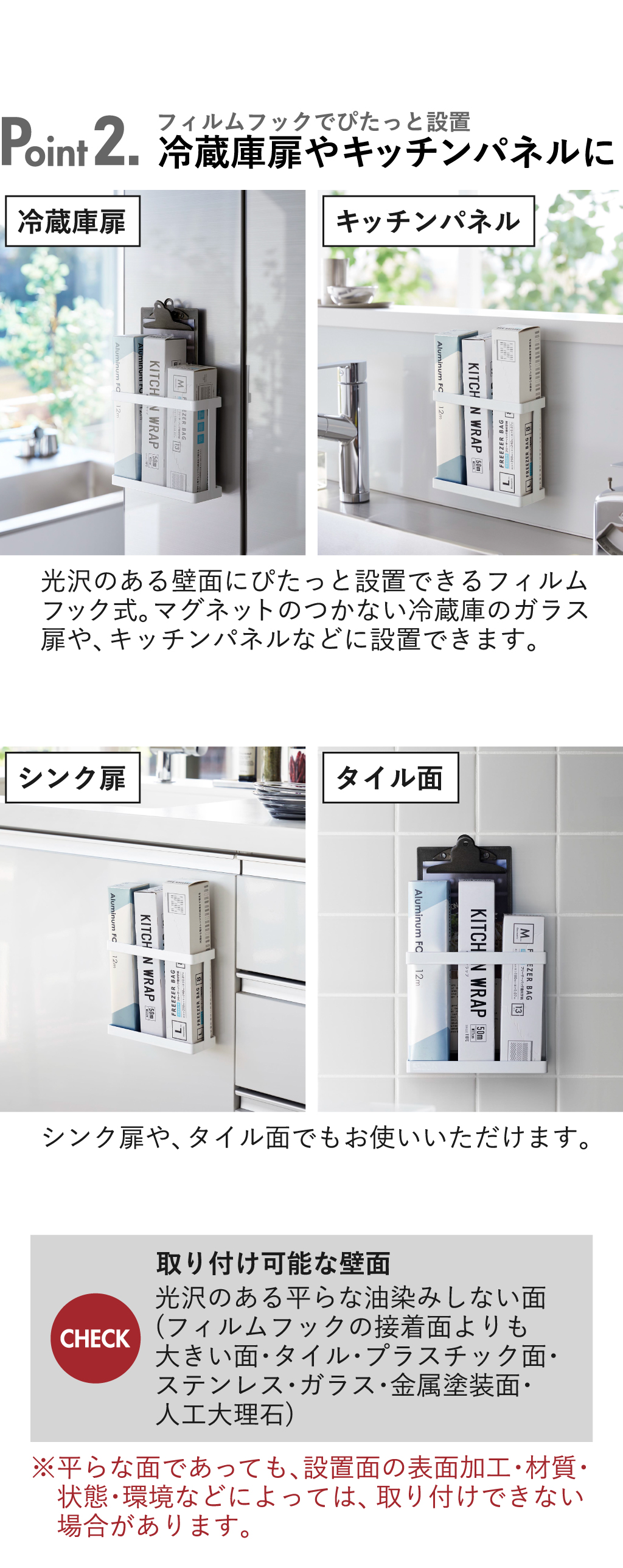(フィルムフックの接着面よりも大きい面・タイル・プラスチック面・ステンレス・ガラス・金属塗装面・人口大理石)