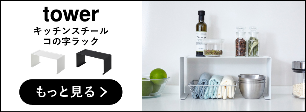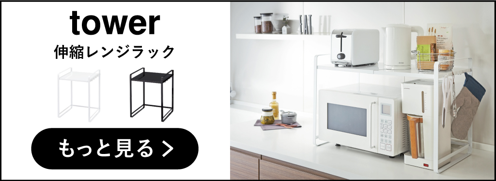 キッチンカウンター上に収納スペースをプラスできる、towerのキッチンラックです。天板は優しい雰囲気を出してくれる天然木製で、空間をよりおしゃれに演出。トースターや電気ケトルなど、家電上のデッドスペースを活かして、今までキッチンカウンターに置いていた小物を、このキッチンラックにすっきり収納できます。壁に穴をあけることなく、手軽にキッチンラックを設置できるのは嬉しいポイントですね。邪魔にならないスリムな奥行きなのに、食器やバスケットなどもしっかり収納。収納力に優れたワイドな横幅で、調味料や観葉植物などをディスプレイしながら収納できます。キッチンカウンター上を美しく整理して、さらにおしゃれなキッチンへ。キッチンラックのフレームは、丈夫なスチール製で、より長くお使いいただけます。2つのキッチンラックを並べることで、さらに収納力が上がり、より統一感のあるインテリアに。キッチンラックの色は、ホワイトとブラックの2色からお選びいただけます。