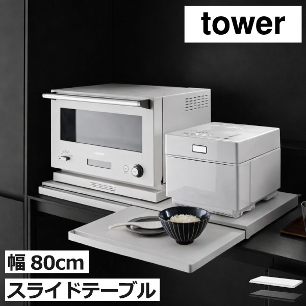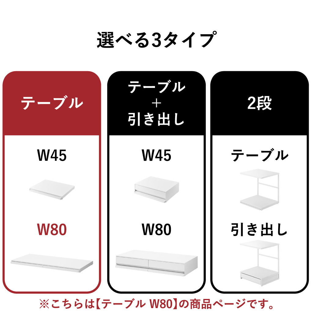 キッチン家電の下に置くだけでスライドテーブルや収納を増やせる、towerシリーズのおしゃれな家電下収納ラックです。電子レンジ・トースター・炊飯器・ケトルなどのキッチン家電を載せてご使用いただけます。家電下スライドテーブルは必要な時にサッと引き出して、料理の一時置きや調理スペースとして活躍。最大約25cm引き出せるので、家電下スライドテーブルの上で広々と作業できます。食事にラップをして電子レンジへ入れる時、ごはんを盛り付ける時などに活躍する家電下スライドテーブルです。収納力抜群の引き出しには、キッチン小物をまとめて収納できます。目隠しして収納することで、生活感が出がちなキッチンまわりがすっきり整います。スチール製の頑丈な家電下収納ラックなので、重たいキッチン家電も安心して載せることができます。家電下収納ラックは「テーブル」「テーブル+引き出し」「2段」の3タイプ。「テーブル」タイプはスリムであまり高さを出さないのが特徴。炊飯器を上に載せる場合でも、ご飯を盛り付けやすいので便利です。「テーブル+引き出し」タイプは、作業台と収納、どちらも増やせるのが魅力。家電下スライドテーブルを使って調理をスムーズにしつつ、キッチン小物を使いたいときにはサッと取り出せて、作業効率アップ。「テーブル」タイプと「テーブル+引き出し」タイプの幅は、コンパクトな「W45」とワイドな「W80」をご用意しました。「2段」タイプはキッチン家電を省スペースにまとめて設置したい方におすすめです。設置場所や用途に合わせて、「2段」タイプはテーブル付きのものと引き出し付きのものからお選びいただけます。おしゃれな家電下収納ラックで、限られたキッチンスペースを賢く広げて、毎日の家事をよりスムーズで心地よく。