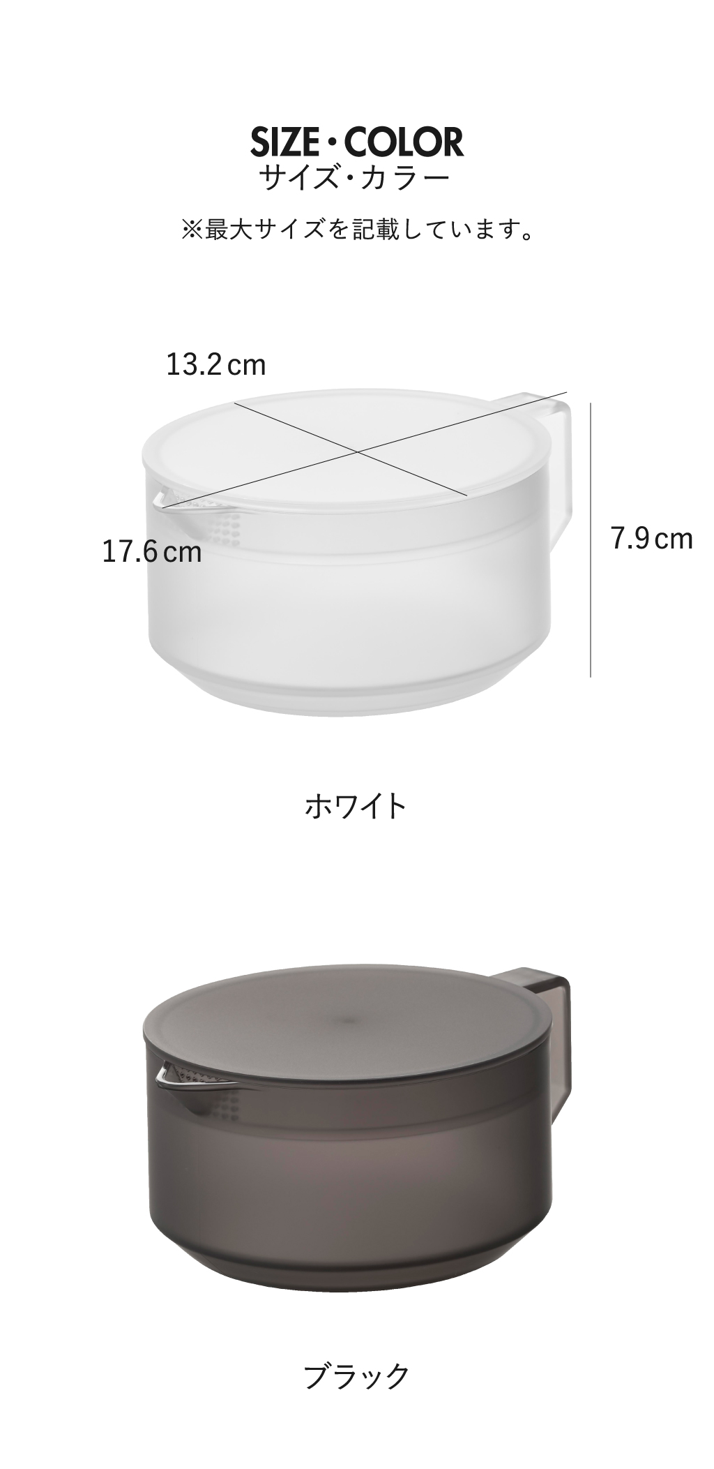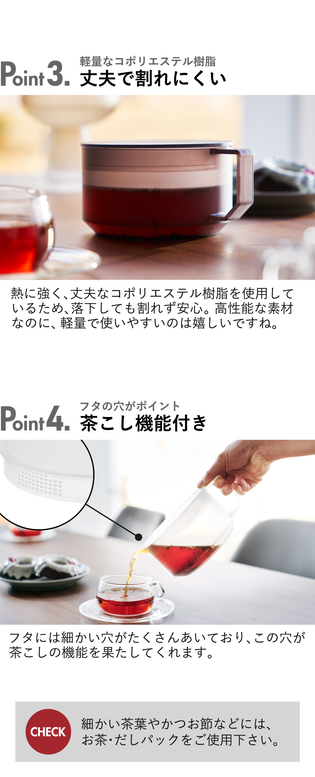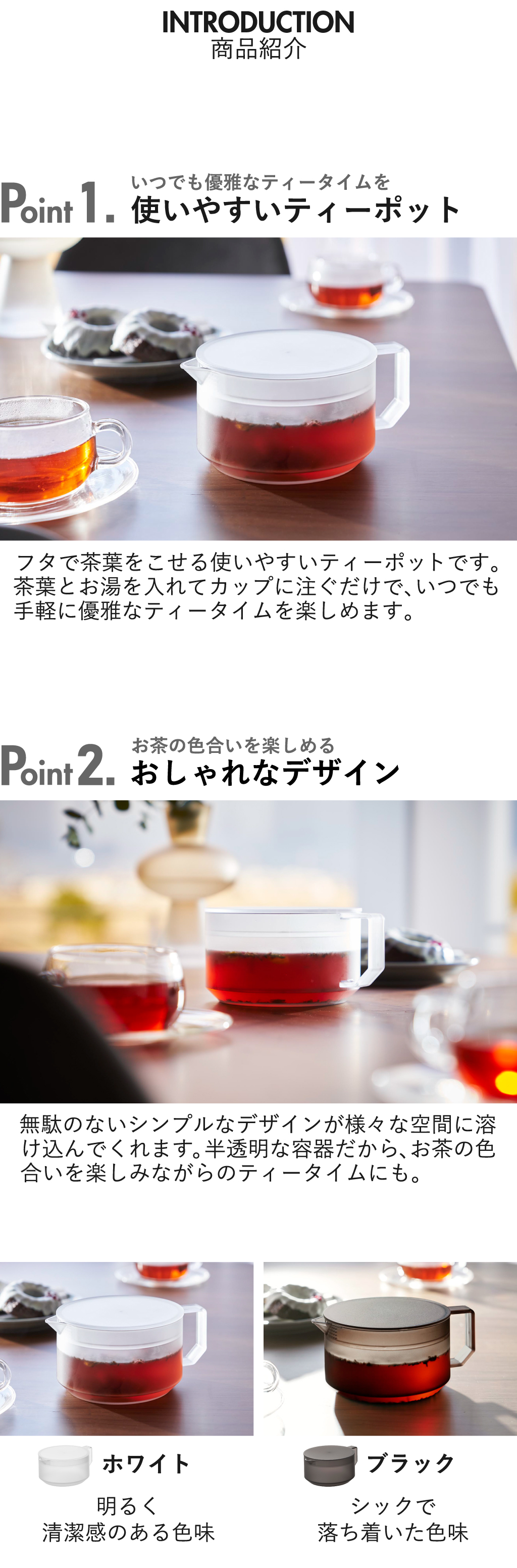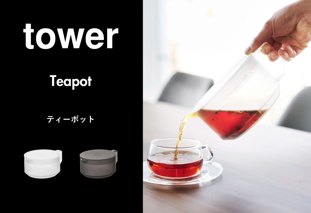 お茶の色合いを楽しみながら優雅なティータイムを過ごせる、towerのティーポットです。フタには細かい穴がたくさんあいており、茶こしの機能を果たしてくれます。ティーポットは、熱に強く丈夫なプラスチック製で、落下しても割れない安心設計。容量600mlとティーカップ3〜5杯分の紅茶を入れられるため、一人暮らしはもちろん、ご家族やご友人とティータイムを楽しみたい方にもおすすめです。容器とフタのみとパーツが少ないので、洗いやすくいつも衛生的。ティーポットは食洗機にも対応しているから、日々のお手入れも楽々です。約100℃まで耐えられるティーポットなので、電子レンジでの温めなおしも可能。高さが出ないから、冷蔵庫内の限られたスペースにもすっきり収まります。ティーポットの色は、ホワイトとブラックの2色からお選びいただけます。