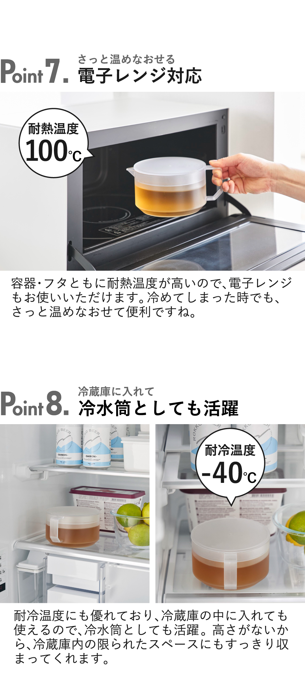 | 耐熱耐冷温度 | 容器・フタ:約100℃/-40℃ |