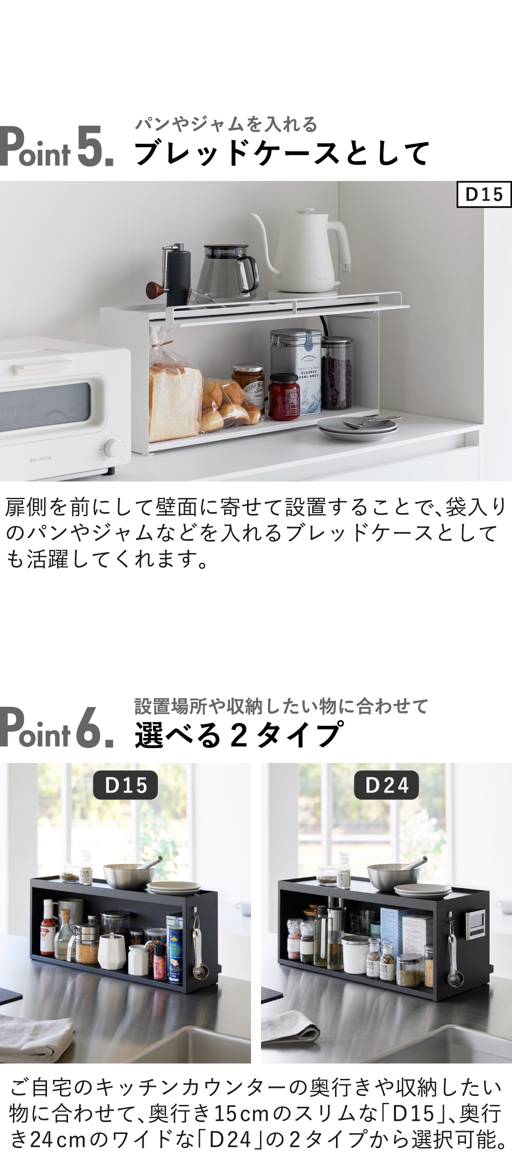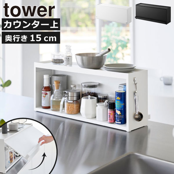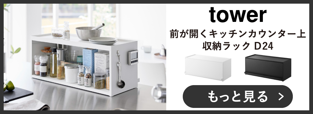 ごちゃつく小物をすっきり収納できる、towerのカウンター上収納です。組み立て不要の完成品なので、そのままキッチンカウンター上に置くだけ。調味料やジャム、茶葉やカップなどをまとめて収納できます。キッチンとリビングどちらからでも手に取れる両面仕様。リビング側には扉が付いており、生活感をオフしてくれます。キッチン側は扉がないから、使いたい時にさっと手に取れて便利です。カウンター上収納の扉は、全面が開くフラップ式で、開けたまま固定できます。収納部だけでなく、天板にも物が置ける2段タイプなので、収納力も作業効率もアップ。カウンター上収納を壁に寄せて設置すれば、ブレッドケースとしても活躍。設置場所や収納したい物に合わせて、奥行きがスリムな「D15」と上にトースターを置ける「D24」の2タイプから選べます。カウンター上収納はスチール製で、キズや汚れに強く、より長くお使いいただけます。磁石がくっつくので、お手持ちのキッチンタイマーなどのマグネット製品を付けられます。カウンター上収納の色は、それぞれホワイトとブラックの2色から選べます。