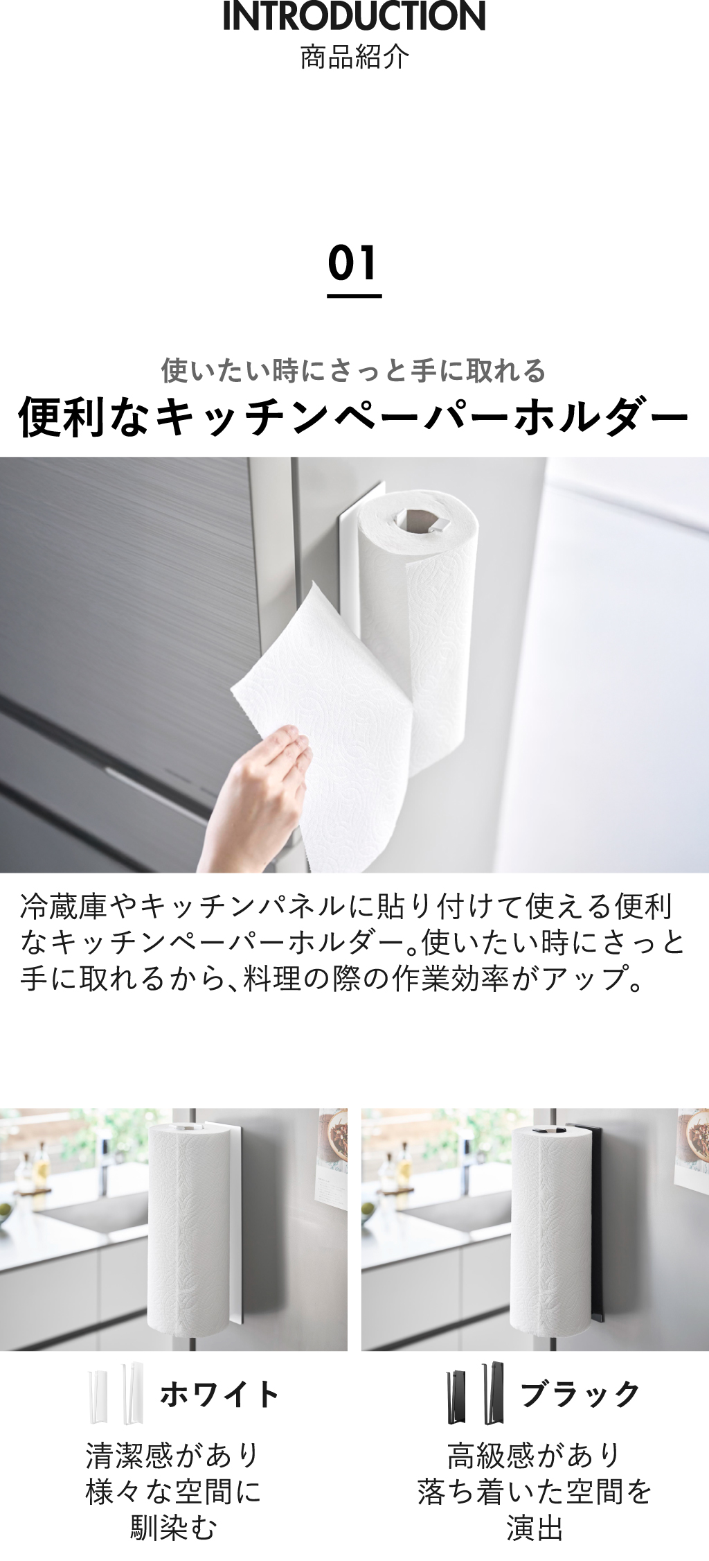 冷蔵庫に貼り付けて使える、マグネット付きキッチンペーパーホルダーです。使いたい時に片手で切れるから、料理の際の作業効率がアップします。キッチンペーパーホルダーの背面には、強力なマグネットが付いていて、キッチンペーパーを取る時のズレや落下を防いでくれます。スーッと出してさっと引くだけで、楽にキッチンペーパーを切ることができます。手がふさがっていたり濡れていても、片手で切れるのはうれしいですね。ロールを上から差し込むだけで、簡単にキッチンペーパーホルダーにセットできます。限られたスペースを活かせる、スリムな縦型タイプのキッチンペーパーホルダー。ロールのサイズに合わせて、「M」と「L」の2サイズからお選びいただけます。一般的なサイズには「M」、大判タイプには「L」サイズがおすすめです。付属の滑り止めリングを使うことで、ストッパーの効き具合を調節できます。片手で切れるキッチンペーパーホルダーの色は、ホワイトとブラックの2色から選択可能。towerシリーズの便利なマグネット収納アイテムで、より快適な暮らしに。