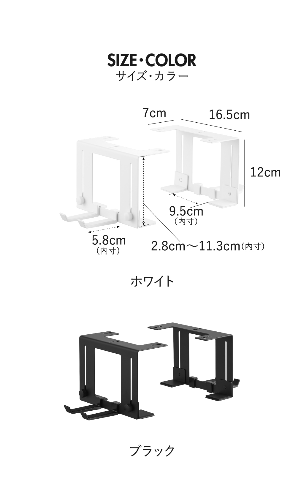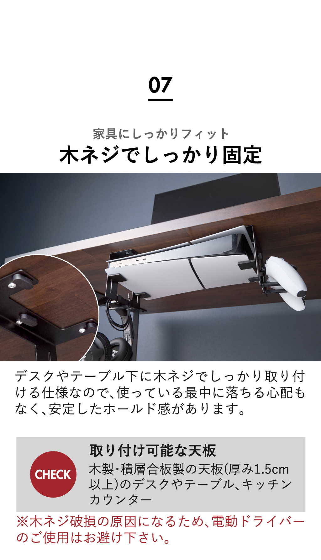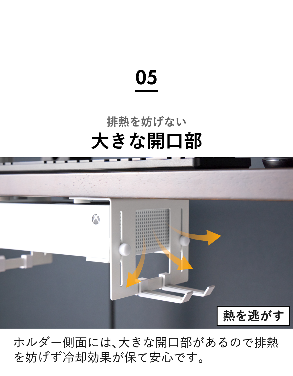 場所をとるゲーム機をすっきりデスク下に収納できる、便利なゲーム機収納ケースです。かさばりがちな本体を浮かせて設置できるので、ほこりが溜まりにくく床の掃除もラクラク。さらに、大きな開口部で排熱を妨げず、本体の冷却効果をしっかり保てる安心設計になっています。手で回せる調節ネジを採用しているため、設置する本体のサイズに合わせてスムーズに微調整可能。可動式の固定ホルダーは斜めにも固定できるので、さまざまな形状のゲーム機に対応します。また、ゲーム機を傷つけないシリコーン付きで、大切な本体を安心して収納できます。付属のフックはお好みの位置に取り付けられ、コントローラーやヘッドセットもまとめて収納できます。このゲーム機収納ケースは、丈夫なスチール製で、耐荷重は本体が5kg、フック1つあたり500g(静止荷重)で、重さのあるゲーム機にも対応。デスクやテーブル、キッチンカウンター下に木ネジでしっかり取り付けられる仕様です。インテリアに馴染むシンプルなデザインのゲーム機収納ケースは、リビングやワークスペースをすっきり快適に保ち、毎日のゲーム時間をより楽しく演出してくれます。