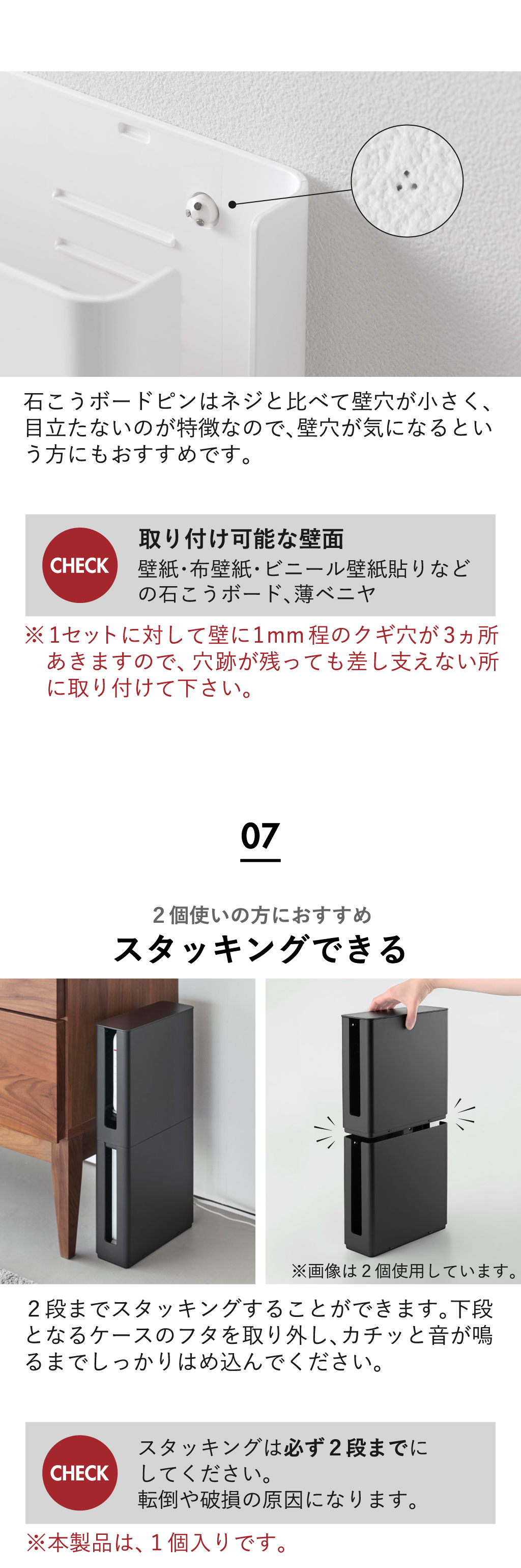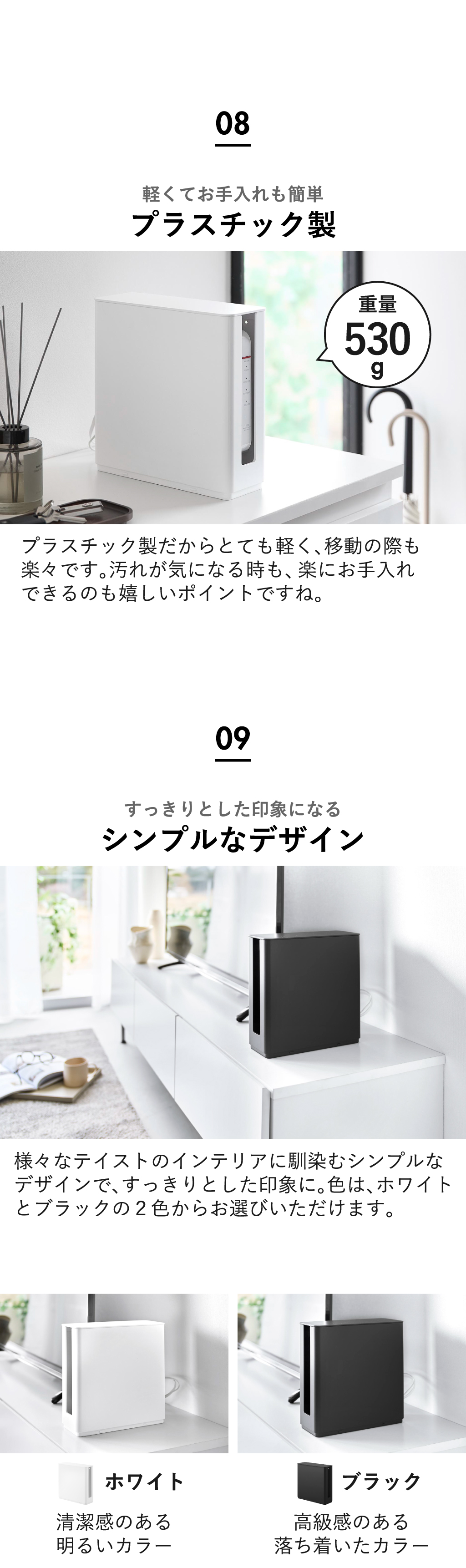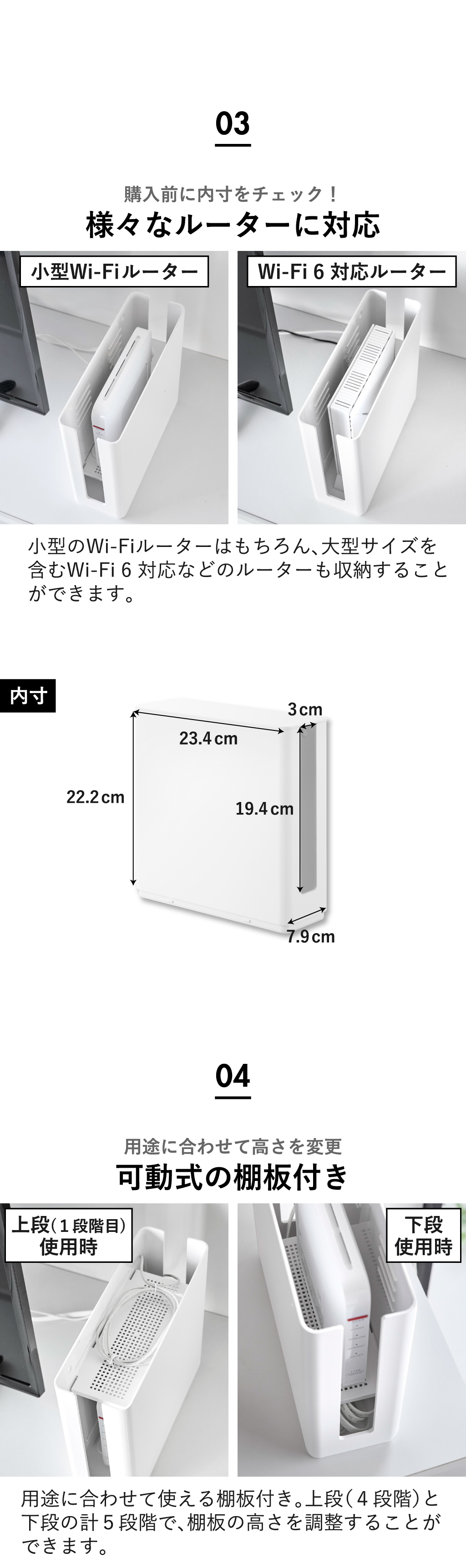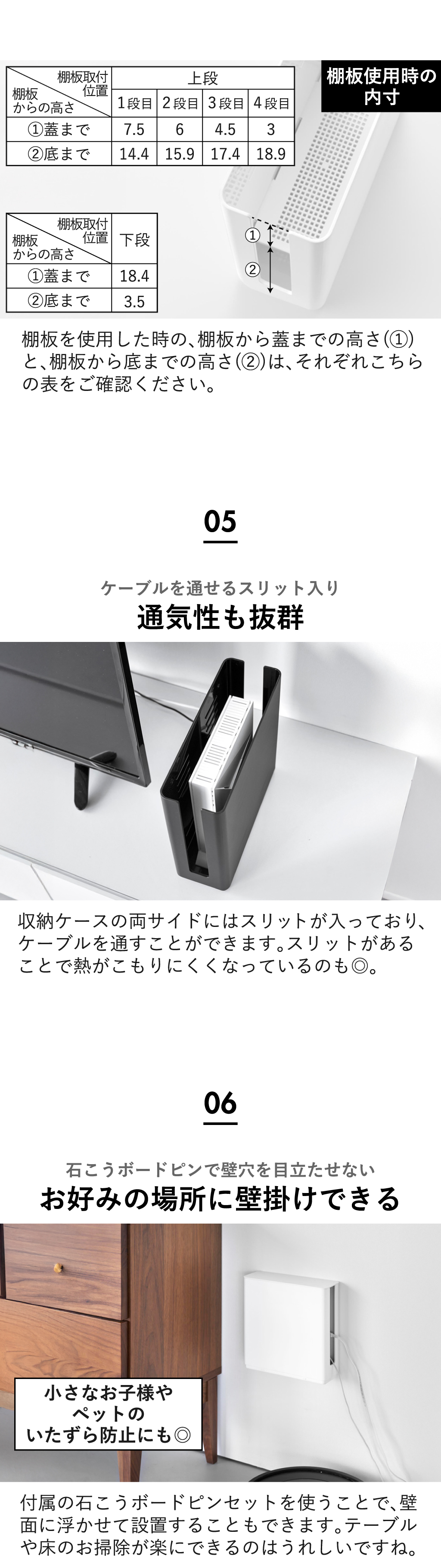 Wi-Fiのルーターを目隠ししてスマートに収納できる、ルーターWifi収納ボックスです。ルーターWifi収納ボックスにはフタが付いていて、上からのほこりの侵入をガード。収納部にはゆとりがあるので、ルーター本体と一緒にコード類も収納できます。ルーターWifi収納ボックスはスリムなので、リビングや寝室の棚など、お好みの場所に設置可能。スリムな小型ルーターはもちろん、大型サイズを含むWi-Fi 6 対応などのルーターも、すっきり収納できるルーターWifi収納ボックスです。ルーターWifi収納ボックスには、用途に合わせて使える棚板が付いています。上段4段階と下段の計5段階で棚板の高さを調節することができます。ルーターWifi収納ボックスの両サイドにはスリットが入っているので、ここからケーブルを通すことができます。通気性がよく、ルーターWifi収納ボックス内に熱がこもりにくいのもうれしいですね。付属の石こうボードピンセットを使うことで、棚いらずで壁掛け設置することも可能。ルーターWifi収納ボックスを浮かせて収納できるので、お掃除の際も楽々です。ラックや棚に置いて使う場合、2段までスタッキングできるので、よりコンパクトに収まります。ルーターWifi収納ボックスの色は、ホワイトとブラックの2色からお選びいただけます。