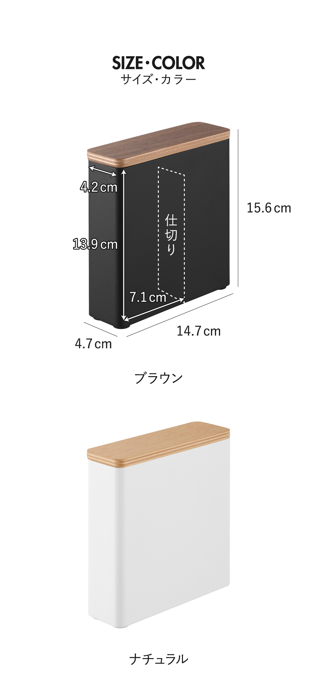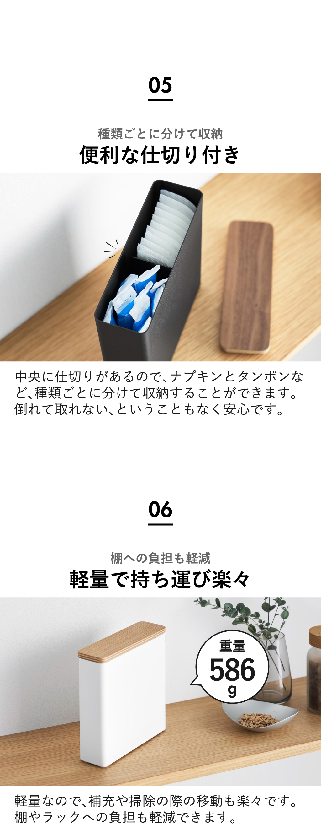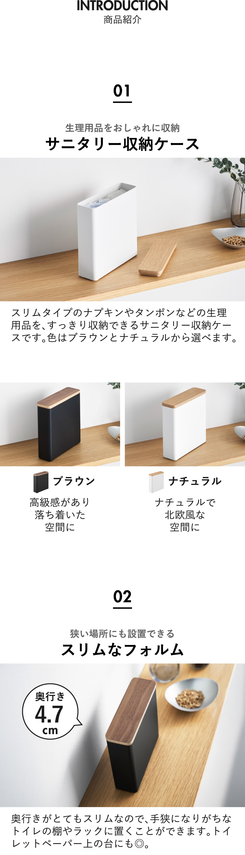 スリムタイプの生理用品をすっきり収納できる、おしゃれなスリムサニタリーボックスです。サニタリーボックスの奥行きは4.7cmと、とてもスリムなトイレ収納アイテムなので、手狭になりがちなトイレ収納用の棚やラック上に置くことができます。木目の美しい天然木製のフタが、中の生理用品を隠してくれます。必要な時にすぐ手にとりたいけど、日頃はトイレ収納に隠しておきたい、という悩みを解決。スリムサニタリーボックスの中央に仕切りがあるので、ナプキンやタンポンなど、種類ごとに分けつつ、立てて収納することができます。スリムサニタリーボックスは、軽量なトイレ収納なので持ち運びも楽々です。スリムサニタリーボックスの本体は丈夫なスチール製で、キズや汚れに強い仕様です。トイレ収納の底面には、シリコーンゴム製のクッションがついていて、キズから守ります。スリムサニタリーボックスの色は、ブラウンとナチュラルの2色からお選びいただけます。木製のトイレ収納アイテム・サニタリーボックスを使って、より温かみのある空間へ。