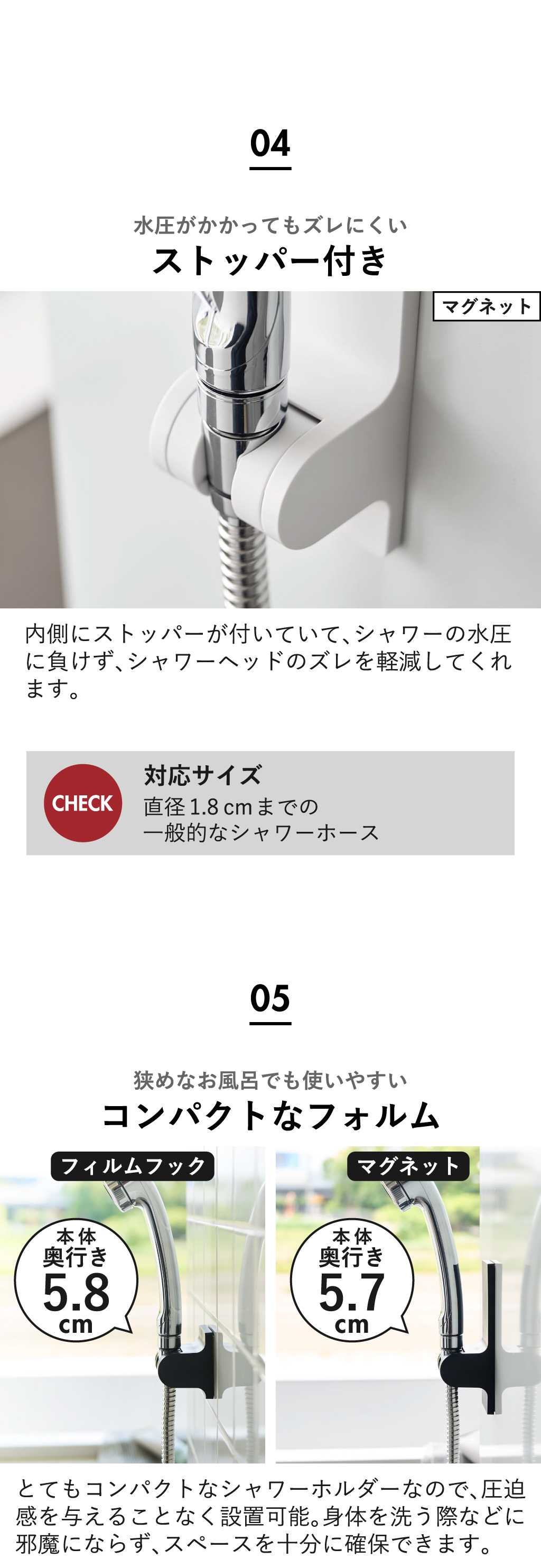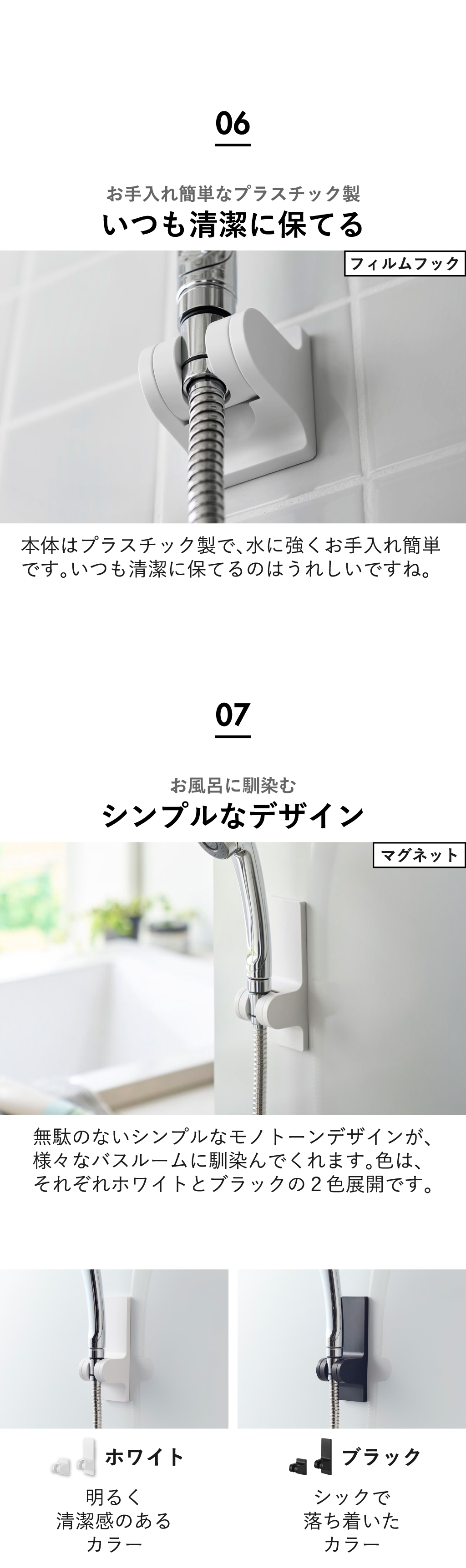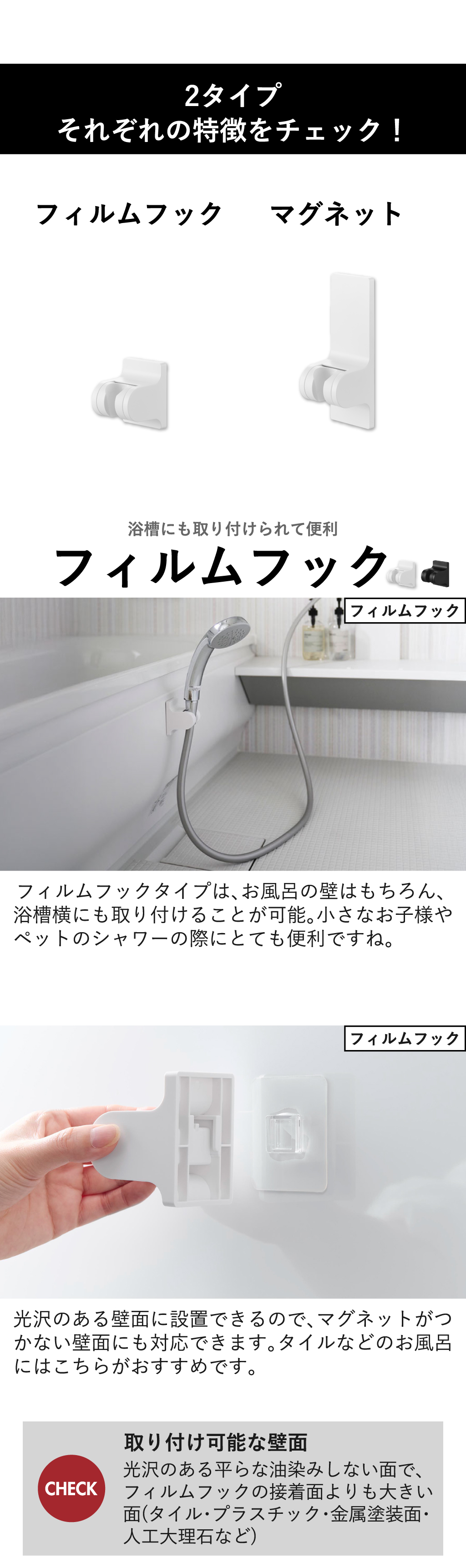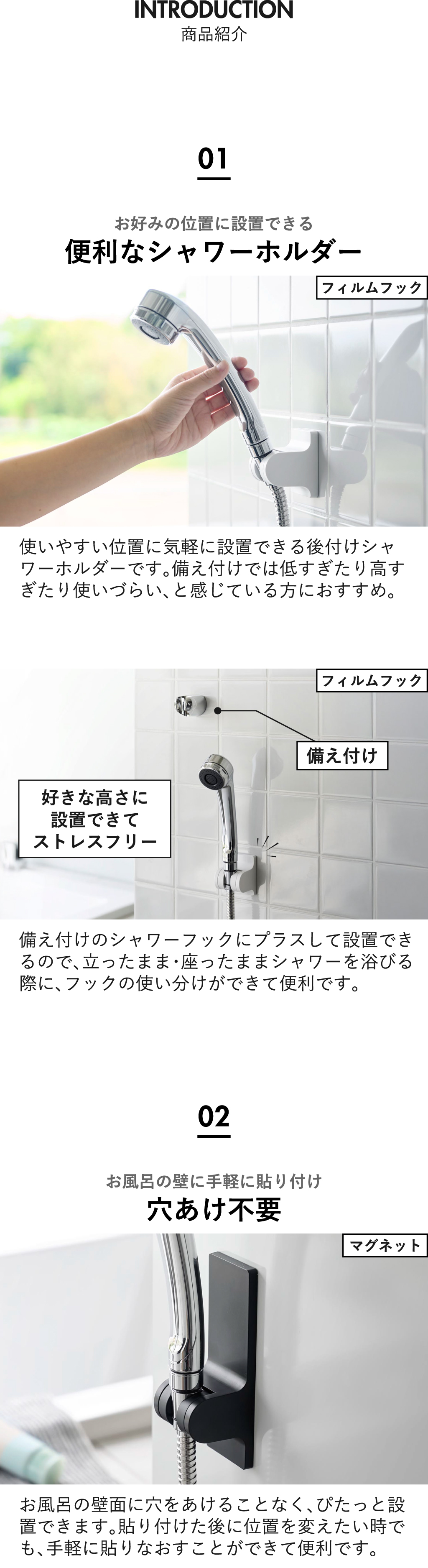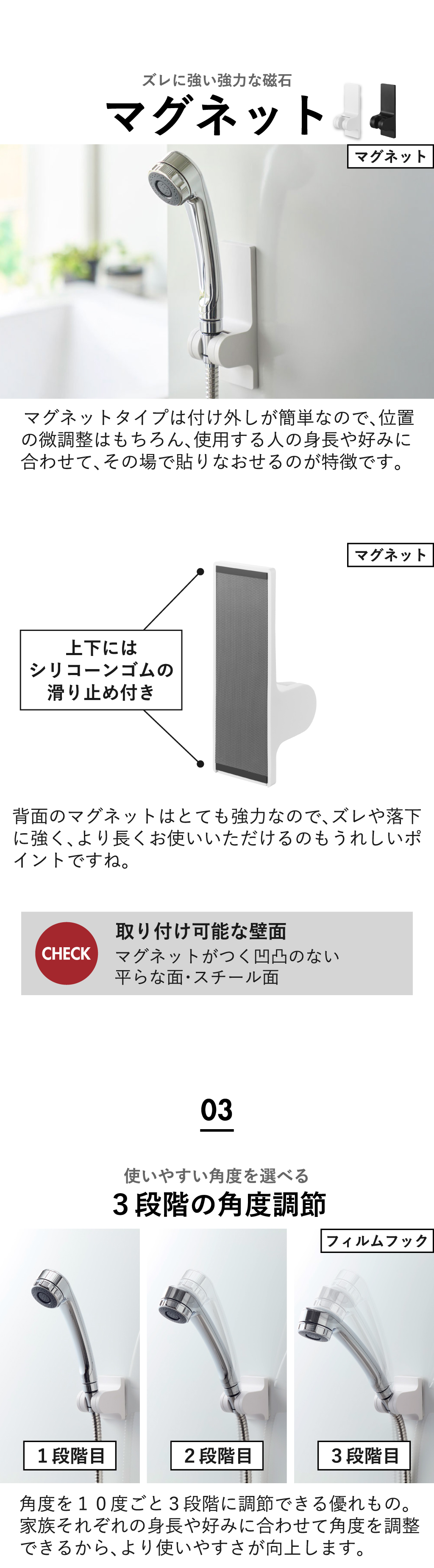 使いやすい位置に気軽に設置できる後付けタイプのシャワーホルダーです。備え付けのシャワーホルダーでは、低すぎたり高すぎたりで使いづらいとお困りの方におすすめ。備え付けのシャワーホルダーにプラスして設置できることで、立ったまま・座ったままシャワーを浴びる際に、フックの使い分けができて便利です。お風呂の壁に穴をあけることなくぴたっと設置できる、フィルムフックタイプと強力なマグネットタイプの2種類からお選びいただけます。フィルムフックタイプは、お風呂の壁に加えて浴室横にも設置できて、小さなお子様やペットのシャワーの際にとても便利です。タイル面に◎。マグネットタイプは付け外しが簡単なので、位置の微調整はもちろん、使用する人の身長や好みに合わせて、その場で貼りなおすことができます。背面のマグネットがとても強力なので、ズレにくく落ちにくいのが特徴です。3段階の角度調節機能付きのシャワーホルダーだから、家族それぞれの身長や好みに合わせてシャワーのあたる角度を変えることができて、使いやすさアップ。シャワーホルダーの色は、それぞれホワイトとブラックの2色からお選びいただけます。
