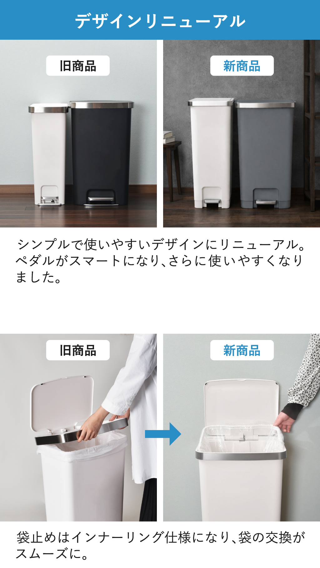両手がふさがっていてもゴミ捨てができる45リットルのペダル式ゴミ箱。手を使わないので、衛生的にゴミを捨てることができます。ソフトクロージング機能で、フタがゆっくり静かに閉まるので、夜間でも安心してお使いいただけます。フタを一番上まで開けると固定できるので、ゴミ箱の上で作業や袋の交換が楽にできます。ペダル式ゴミ箱は、袋止めが付いているのでゴミ袋のズレやはみ出しを防げます。外からゴミ袋が見えず、生活感を抑えることができます。また、45Lのペダル式ゴミ箱には掃除の際にスムーズに移動できるよう、本体下部の後方に2輪のキャスターが付いています。少し持ち上げるだけで簡単に動かせます。ゴミ箱の表面は、指紋や汚れが付きにくいマット素材。汚れてもサッと拭き取るだけで清潔を維持できます。置く場所に合わせて「縦型」と「横型」2タイプから選べる45リットルのペダル式ゴミ箱。スペースを取らないスリム設計の縦型は、狭い隙間やキッチンにもすっきり収まります。広々ワイドで安定感抜群の横型は、横幅が広くたっぷりゴミを入れても倒れにくく安定して置けます。たっぷり捨てられる45Lの大容量サイズ。広い開口部で、かさばるパッケージや生ゴミもスムーズに捨てられます。シンプルで洗練されたデザインがキッチンやリビングなどさまざまな空間に自然になじみます。