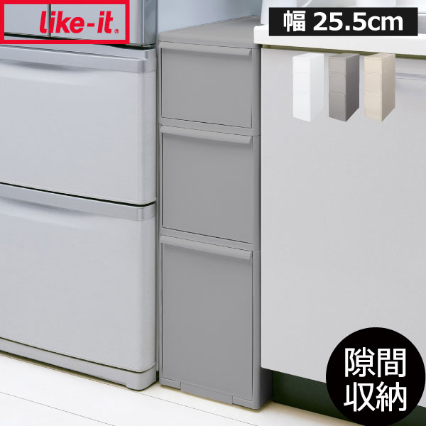キッチンや洗面所などのちょっとした隙間を有効活用して収納スペースを増やせる収納ケース。幅が3種類14cm、17cm、25.5cmと隙間に合わせて組み合わせも自由自在。この収納ケースは、側面がフラットなので、ほこりが溜まらずお手入れもラクラク。シンプルなデザインでどんな部屋でも馴染みやすいのが特徴です。引き出しの中身が見えないので生活感を隠すこともできます。引き出しには、軽い力でもスッと開閉できる握りやすい取っ手と、万が一引き出しを勢いよく引き出してしまっても安心のストッパーが付いています。