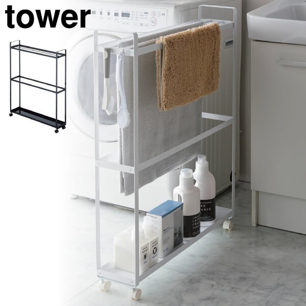 シンプルで清潔感のある、ワゴンタイプのバスタオルハンガーです。スリムなサイズ感で、約15cmの隙間にぴったりと収まります。洗濯機横のデッドスペースを有効に使うことができます。