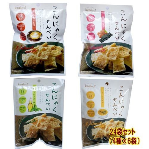 こんにゃくせんべい ハーブ&ビネガー:こんにゃく粉、砂糖、ハーブビネガー風シーズニング(砂糖、食塩、粉末醤油、たん白加水分解物、粉末醸造酢、ガーリック末、コショウ末、乾燥バジル、酵母エキスパウダー、唐辛子末)、和風だし(食塩、ブトウ糖、鰹節粉末、昆布エキス、たん白加水分解物)、食塩、香辛料/加工デンプン、調味料(アミノ酸等)、水酸化カルシウム、調味料(アミノ酸等)、甘味料(スクラロース)、リン酸三カルシウム、香料(原材料の一部に小麦、大豆、を含む)
