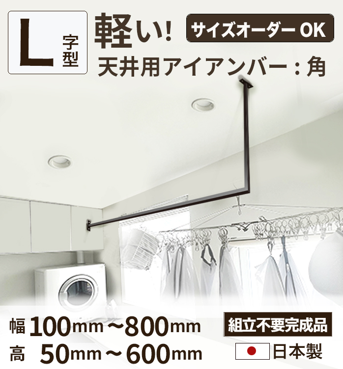 【 L字型1 】【 10mm刻みでサイズが選べる天井アイアンバー 】【 幅100〜800mm 】オーダー 室内 物干し バー 黒 ホワイト ランドリー 洗濯干し 受注生産 日本製