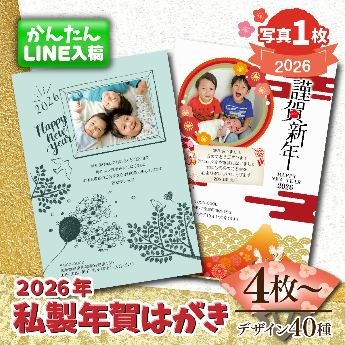 2026年 写真 1枚 私製年賀 写真入り 送料無料 2026 年賀状印刷 印刷 年賀 私製ハガキ はがき おしゃれ オリジナル デザイン 孫 子供 家族 午 うま年 令和8年