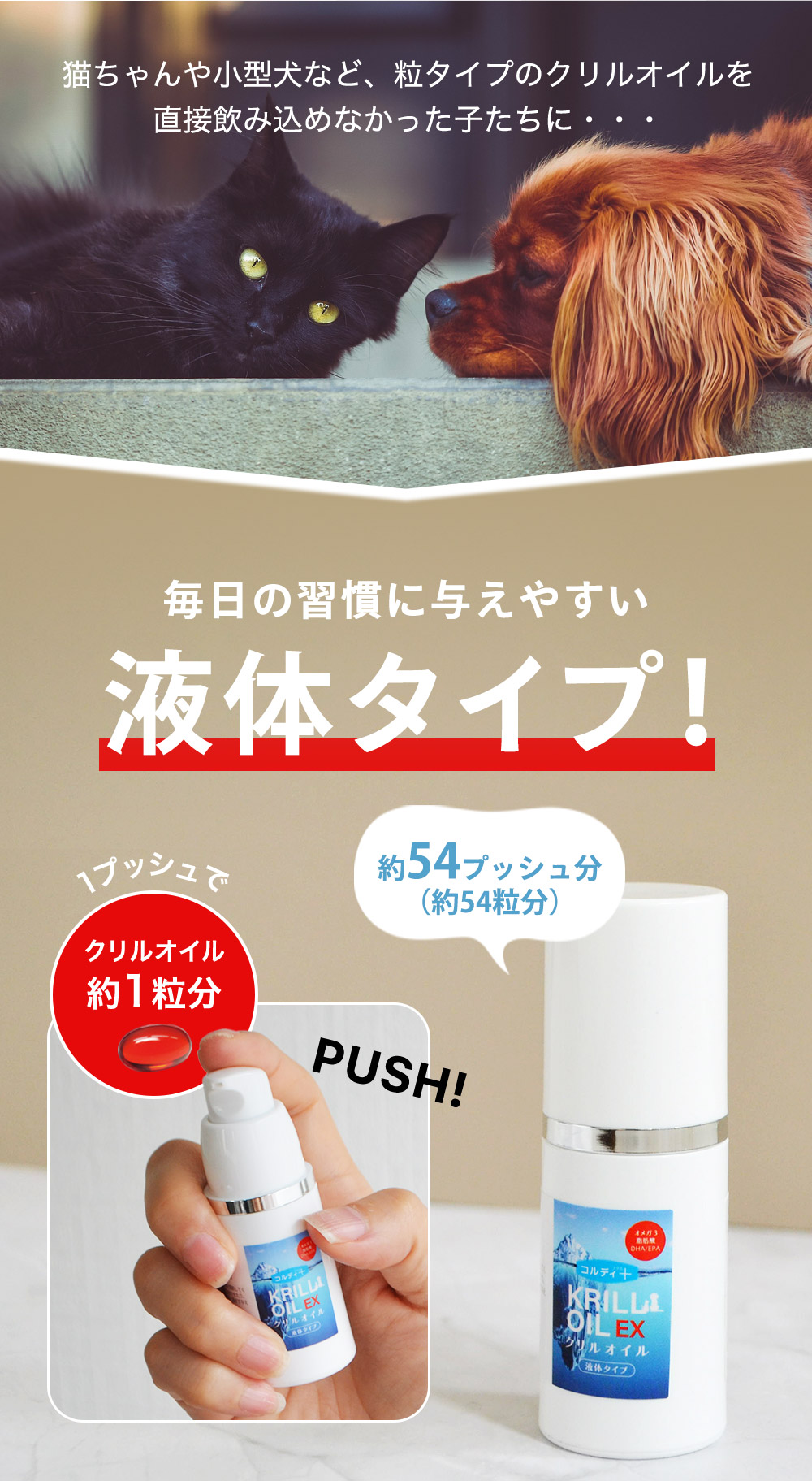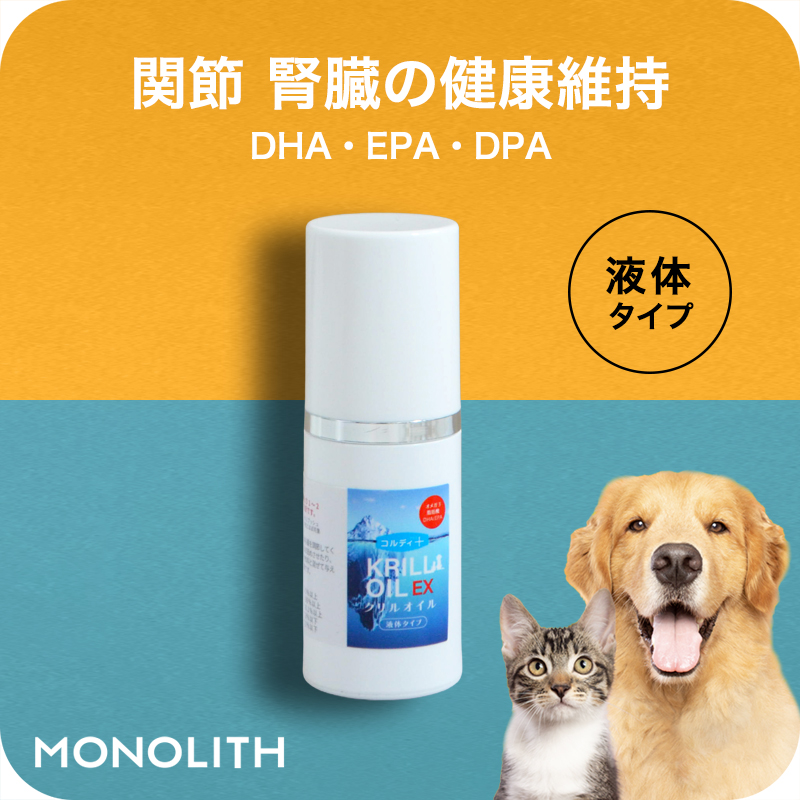 | 与え方 | 体重5kgあたり1〜2プッシュ分が目安です 必要に応じて供与料を調整してください。そのまま舐めさせたり、ペットフードや飲料と混ぜて与えて頂いても結構です。 ご使用後はフタをしっかりと閉めて保管してください。 クリルオイルEXのスポイト1回分はクリルオイル1粒とほぼ同量を計りとれます。 | 販売者 | 株式会社モノリス |