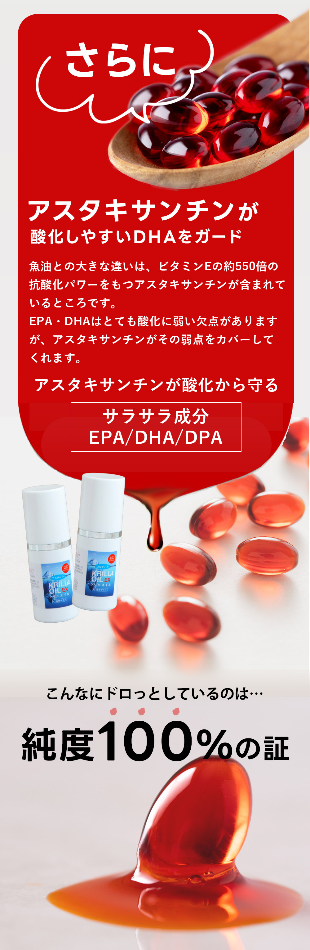 | 他社のクリルオイルではサラダオイルを混ぜてさらさらしたものを見かけます。 クリルオイルは本来ドロッとした質感を持っているもの。 モノリスのクリルオイルは100%純粋なクリルオイル。 ドロっとしているのは、栄養がたっぷり詰まっている証拠です。 |
