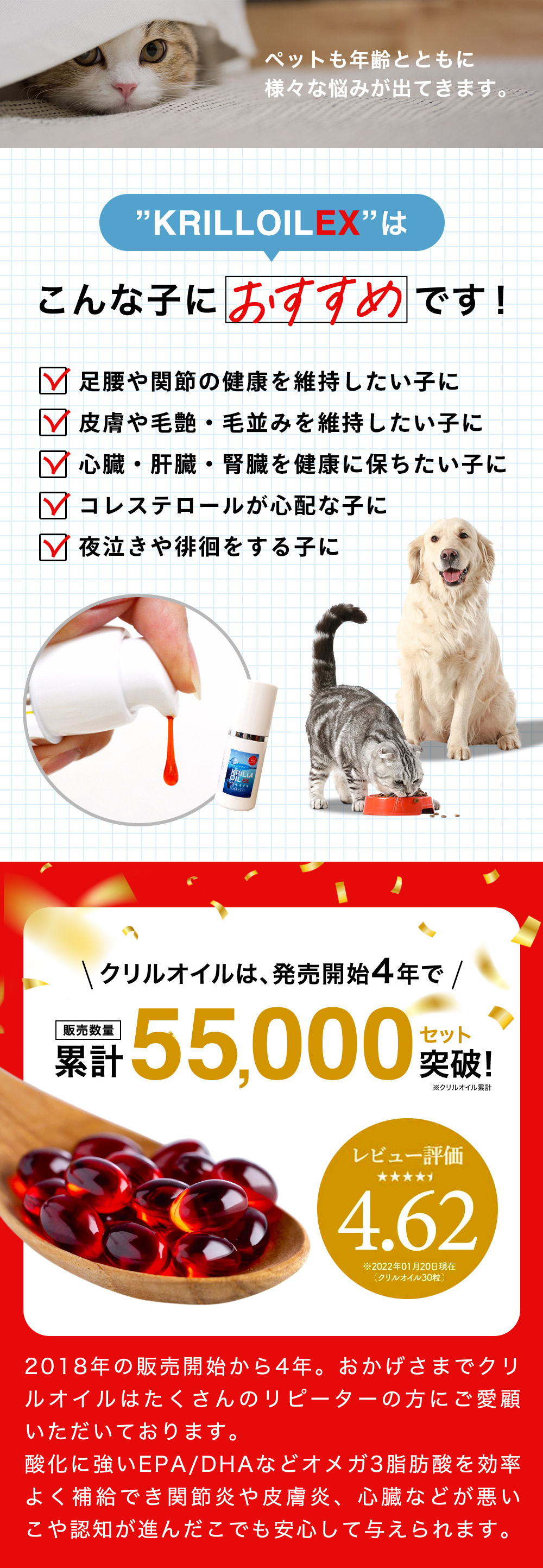 | 使用上の注意 | 甲殻類アレルギーのある場合は召し上がらないでください。油分が冷え固まり白くなることがありますが品質に問題はございません。体質に合わないときは、ご使用を中止し、かかりつけ獣医にご相談ください。 |