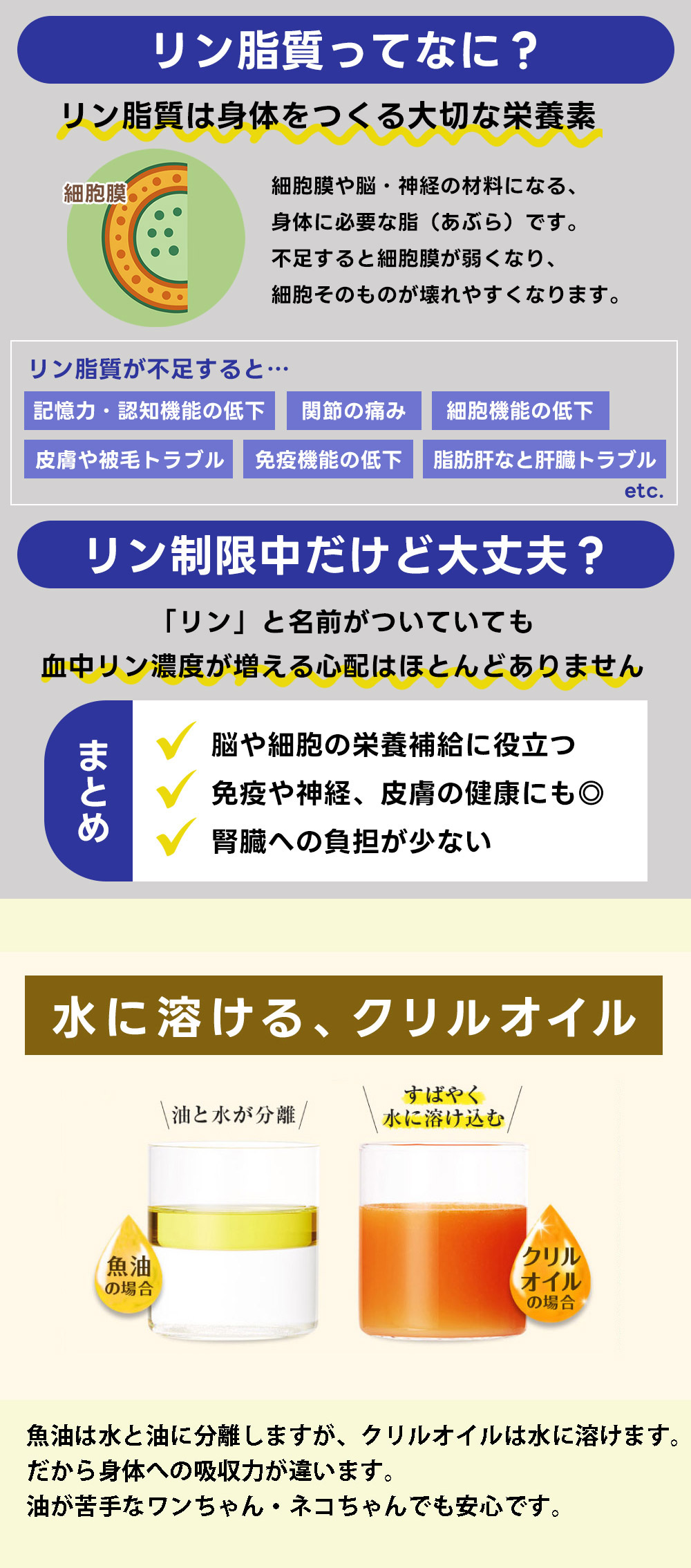 | クリルオイルの吸収率の高さの秘密 クリルオイルに含まれるオメガ3脂肪酸(EPAやDHA)は、 魚油と比べて3倍以上も吸収されやすくなっています。 なぜなら、これらは「リン脂質」というものに結びついているからです。 「リン脂質」は、魚油には含まれていません。 リン脂質のおかげで、これらの栄養素は体内に取り込まれ、すぐに利用されます。 リン脂質は体や脳のすべての細胞膜の材料です。 さらに細胞を柔らかく保ち、外からのダメージを防ぎながら、酸素や栄養を細胞内に取り込むのを助けます。 この働きにより、クリルオイルは体全体の健康維持や脳の働きをより効果的にサポートしてくれます。 |