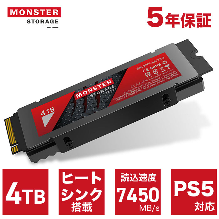 Monster Storage SSD 4TB NVMe PCIe Gen4×4 最大読込:7,450MB/s 最大書き:6,500MB/s PS5確認済み ヒートシンク付きM.2 Type 2280 3D TLC MS950G70PCle4HS-04TB