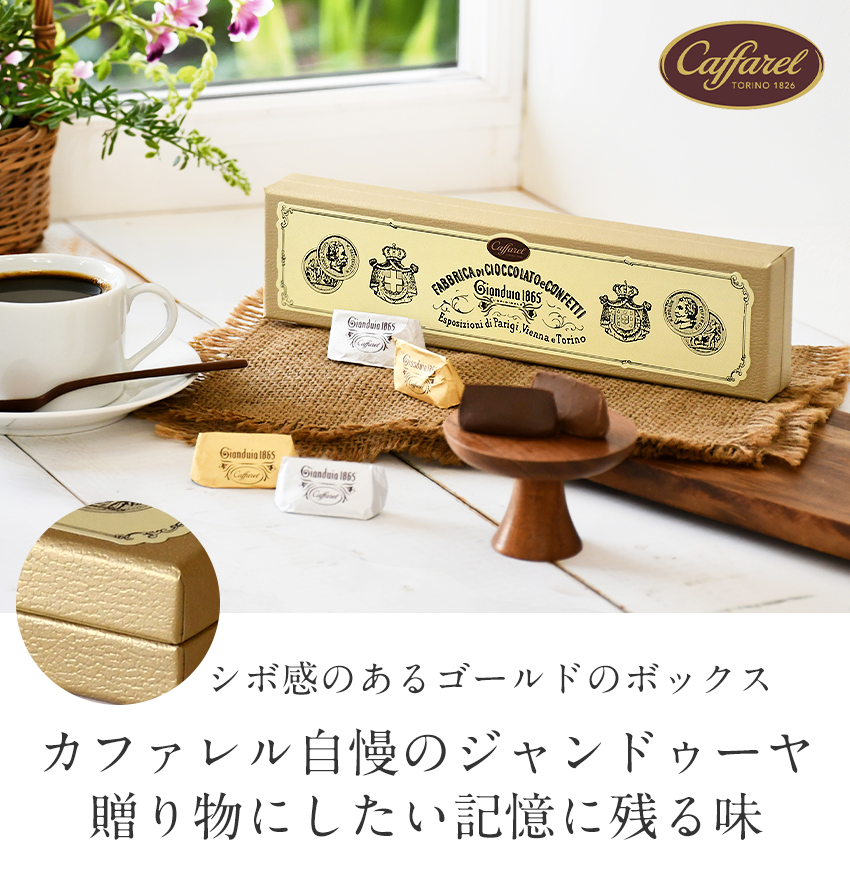 ─ Caffarel ─ ( カファレル ) 王室・貴族御用達。195年以上の歴史あるイタリア・トリノのチョコレートブランド「カファレル」 1826年、創業者ピエール・ポール・カファレルによって、イタリアピエモンテ州の街トリノで最初のチョコレート会社として始まりました。 イタリアチョコレートの代表でヘーゼルナッツを贅沢に練り込んだ「ジャンドゥーヤチョコレート」は、カファレル社のチョコレート職人が発祥であり、当時の世界中のグルメの食卓に乗りました。高い品質と優れた味わいは、古くからヨーロッパ各地の王室や貴族ご用達チョコレートとして認められ、イタリアのチョコレート業界の老舗ブランドとして、世界中のグルメに愛され続けています。 チョコレートの品質の重要性を本当の意味で理解し、厳選された材料のみを使用し、他社では決して真似のできないチョコレートを作り続けています。