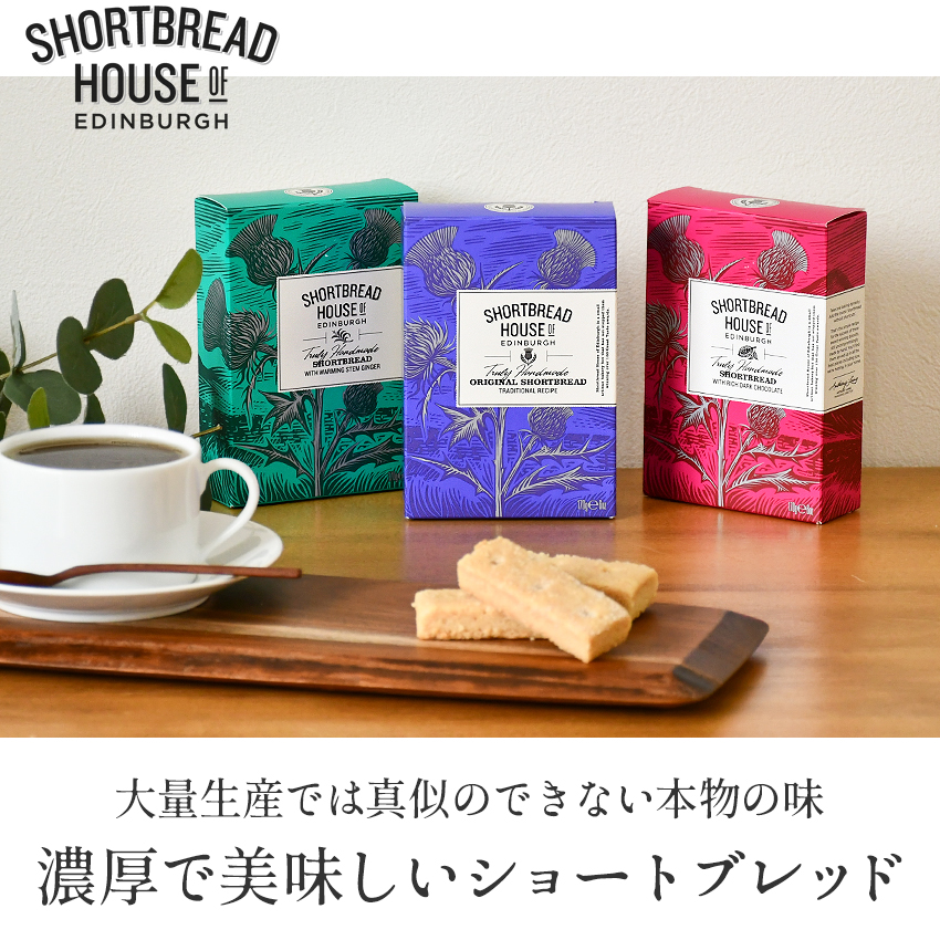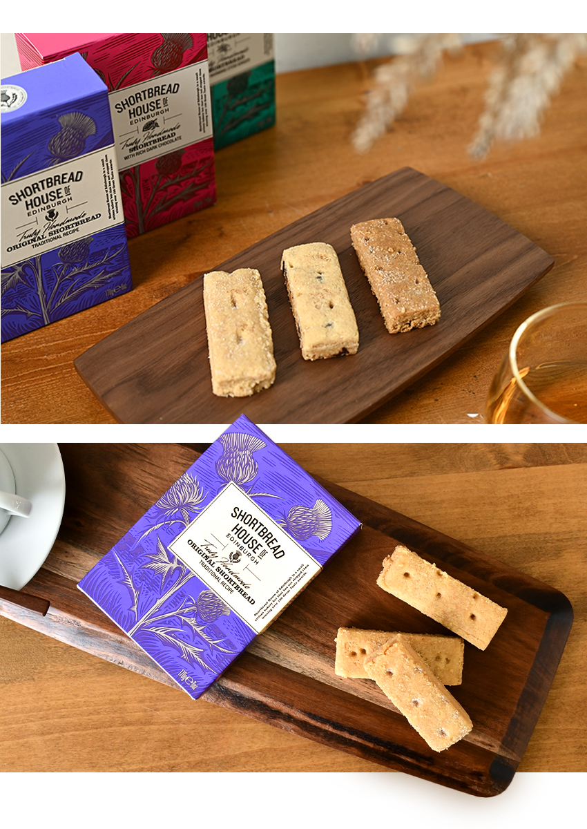 ─ SHORTBREAD HOUSE OF EDINBURGH ─ ( ショートブレッドハウス オブ エディンバラ ) 1989年、アンソニーと妻のフィオナが、スコットランドの首都エディンバラで何世代にもわたるパンと焼き菓子作りの経験もつレイン家の歴史を引き継ぐため、3人の子どもたちと共に小さなベーカリーを開業したことから始まりました。 「shortbread without shortcuts(手抜きなしのショートブレッド)」は5つ星ホテルやフォートナム&メイソンなどの有名百貨店で販売され、英国中の多くの人に愛されています。
