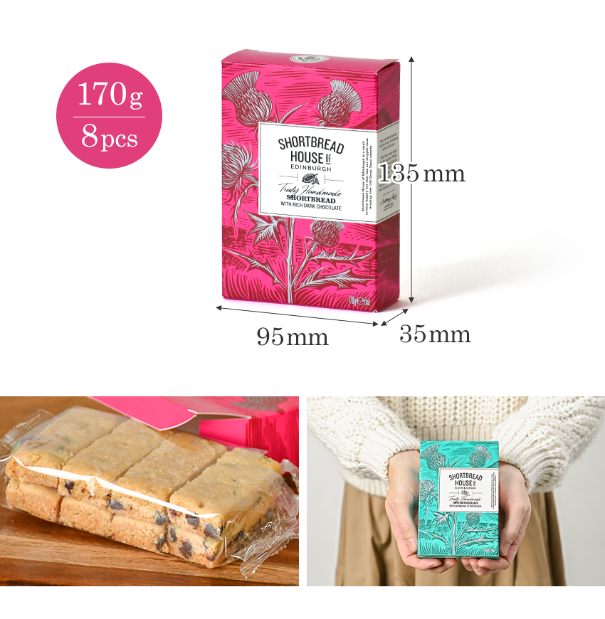 Shortbread without short cuts.(手抜きなしのショートブレッド)の信念のもと、生地作りから焼き上げまで全ての工程を手作業で行っている「ショートブレッドハウス オブ エディンバラ」。 大きなミキサーや成型機を使わず、バターや粉の質感を手で感じ取りながら生地をまとめ、ひとつひとつカットや型抜きをしてオーブンでじっくりと焼き上げます。 材料選びにも一切妥協せず、「素材の力をそのまま伝えること」を大切にし、小麦粉や砂糖も余計な加工が施されていないものを選び、芳醇な香りを持つスコットランド産のバターをふんだんに使用して作られます。 さっくりとした表面に、ほろりとほどける独特の食感、口に入れた瞬間に広がるバターのコクと口どけの良さ。シンプルだからこそ際立つ違いは、本場の味を求める英国菓子愛好家からも高く支持され、ハロッズなどの有名百貨店でも販売されています。 英国らしいカラフルなパッケージは、お土産や贈り物としても人気です。