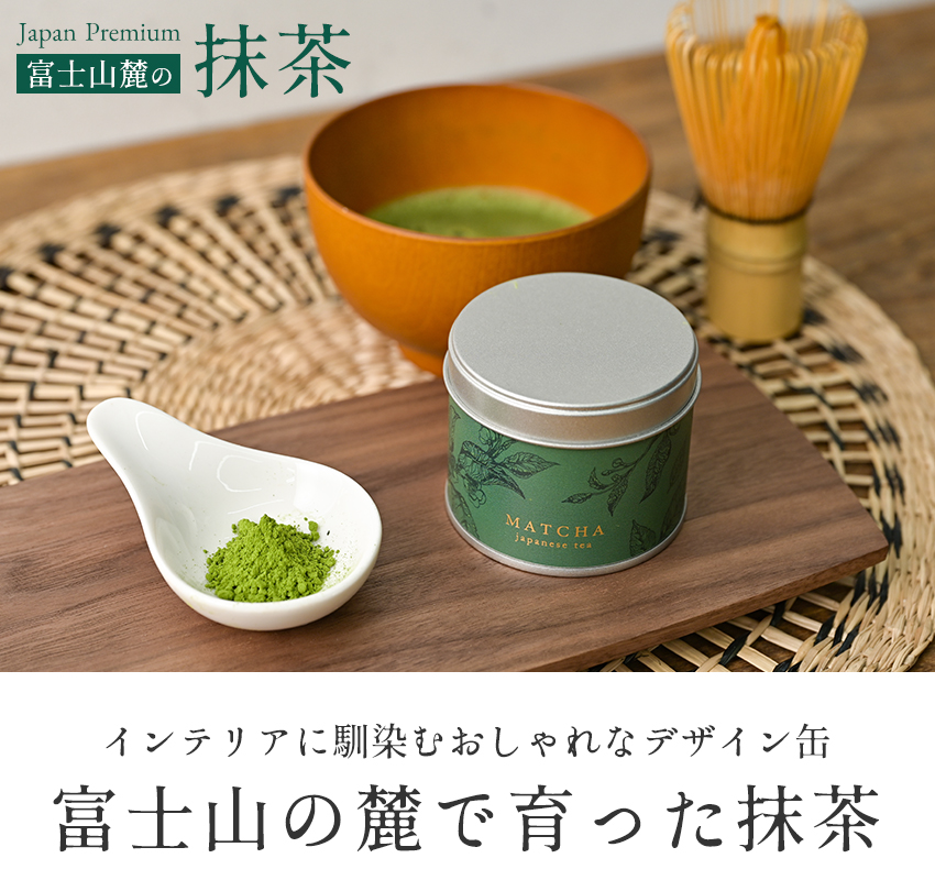 現代のインテリアに馴染む素敵な缶に入った、富士山の麓、静岡県で栽培された抹茶です。