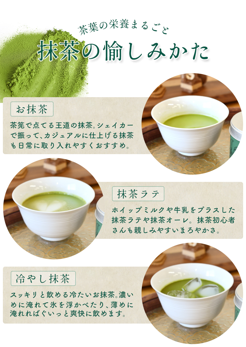 美しいエメラルドグリーンで優しい甘みとクリーミーな口あたり。ほんのわずかな渋みを感じられます。まろやかでありながら、引き締まった味わいが楽しめるのも大きな特徴。