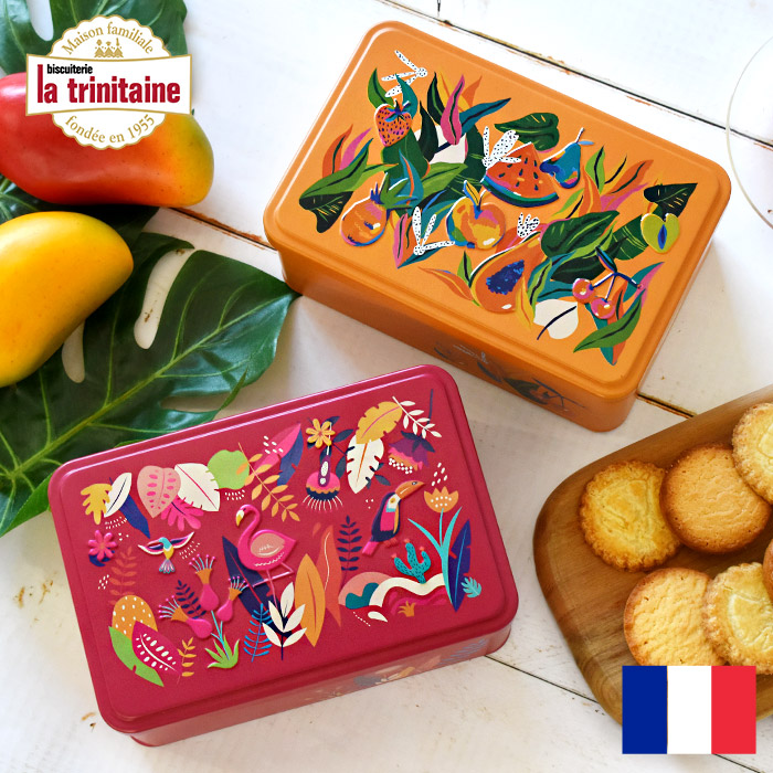 草花やフルーツ、南国の動物たちがアーティスティックに描かれたおしゃれなフラワーアート缶。 絵柄に合わせた凹凸加工が上品で奥行きを表現し、光の加減でメタリックにも発色する遊び心のある美しい絵柄です。 本体側面にも植物やカラフルな鳥たち、フルーツが描かれ、ティータイムを賑やかに彩ります。 中身はフランスを代表とする薄焼きガレット、厚焼きパレットの詰め合わせ。 ほろほろ、ザクザクした食べごたえのある食感と、新鮮なバターの風味がきいた2種類の味が楽しめます。 食べ終わった後の缶は思わず取っておきたくなるほどお洒落。