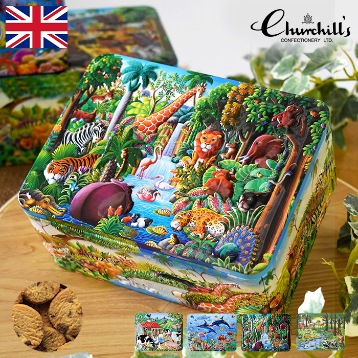 イギリスのチャーチル発、お菓子の詰まったギフト缶。お菓子の缶とは思えないほど繊細なデザイン。 のどかな牧場の様子が描かれたファームヤード缶。 イルカやカメ、カラフルな魚達が泳ぐオーシャン缶。 ジャングルでたくさんの動物が暮らすネイチャーフレンド缶。 生き生きとした森の動物たちが描かれたフォレスト缶の4種類。 どれも色鮮やかな絵柄に合わせた凹凸加工は奥行きを感じさせ、世界中のコレクターを魅了して離しません。 側面全ての絵柄が異なるので、まるで絵本を見ているかのようにそれぞれの面の絵をお楽しみいただけます。 中身はミルクやコーヒーと相性抜群な、一口サイズのチョコチップ入りバタークッキー。 食べ終わった後の缶は思わず取っておきたくなるほどお洒落で、小物入れなどにお使いいただけます。