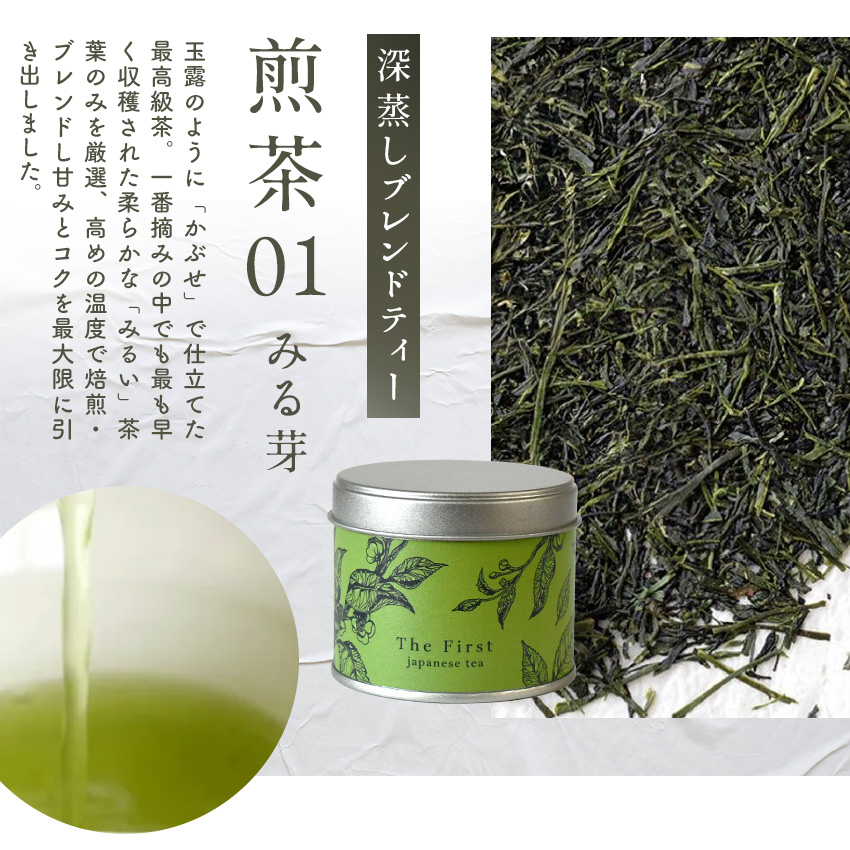 深蒸しブレンドティー「煎茶01 みる芽」は、一番摘みの中でも最も早く収穫された柔らかな「みるい」茶葉のみを厳選、高めの温度で焙煎・ブレンドし甘みとコクを最大限に引き出した「かぶせ」仕立ての最高級茶です。