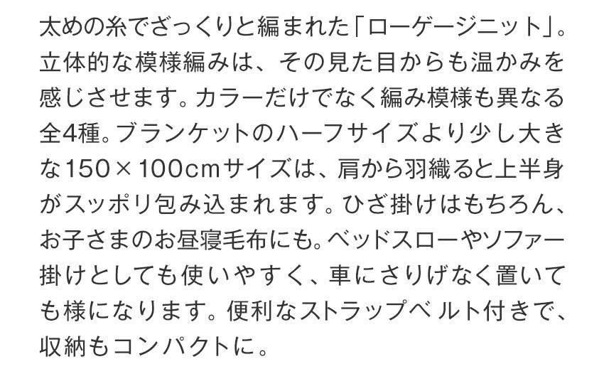 太めの糸でざっくりと編まれた「ローゲージニット」。立体的な模様編みは、その見た目からも温かみを感じさせます。カラーだけでなく編み模様も異なる全4種。ブランケットのハーフサイズより少し大きな150×100cmで、肩から羽織ると上半身がスッポリ包み込まれます。ひざ掛けはもちろん、お子さまのお昼寝毛布にも。ベッドスローやソファー掛けとしても使いやすく、車にさりげなく置いても様になります。便利なストラップベルト付きで、収納もコンパクトに。
