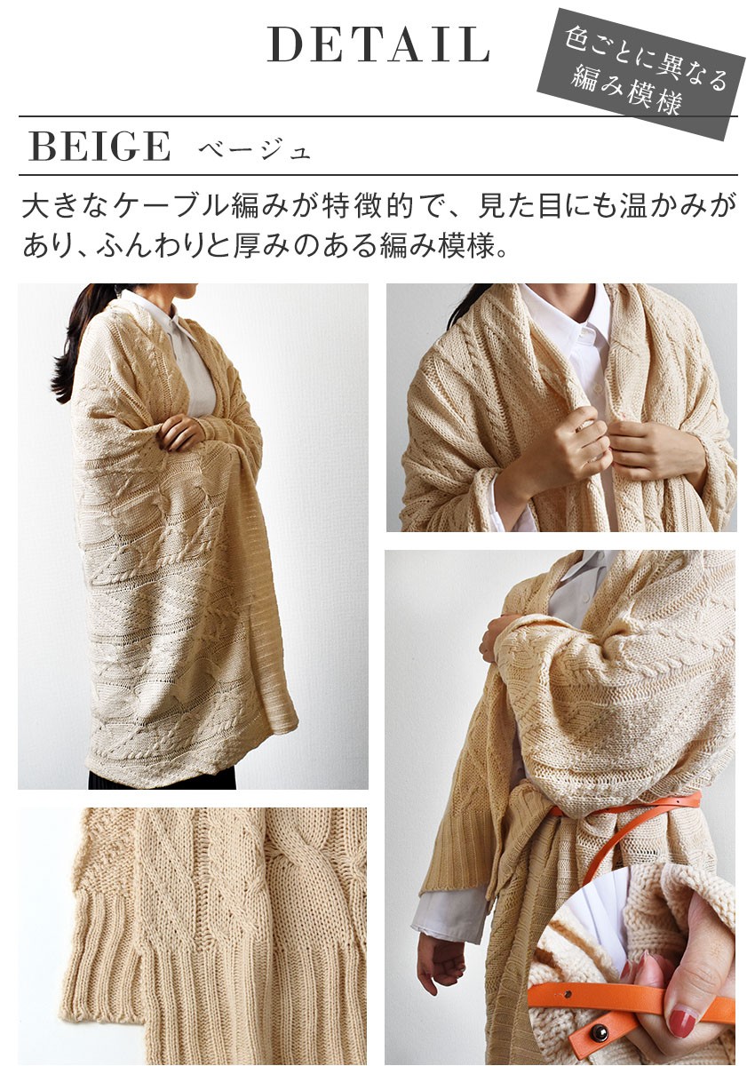 模様編みは全4種。ブランケットのハーフサイズより少し大きな150×100cmサイズは、肩から羽織ると上半身がスッポリ包み込まれます。