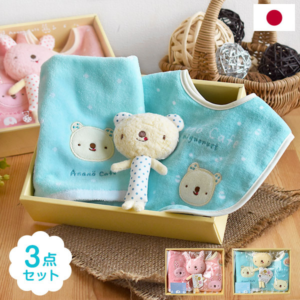 ベビーギフトセットM 3点セット 出産祝い 新生児 日本製 スタイ マスコット ガラガラ ニギニギ ハンドタオル 女の子 男の子 赤ちゃん プレゼント 誕生日 KB214-