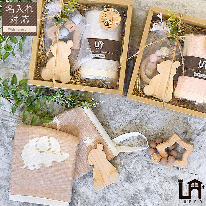 ナチュラルな雰囲気のベビーアイテムは、おしゃれママにも大人気。センスの良いベビーギフトを贈りたい方におすすめです。中身の見えるボックスにフェイクグリーンや麻紐をあしらったラッピング仕様なので、そのままお渡しいただけます。 レーザー名入れも承れます、赤ちゃんのお名前を入れると、さらに特別なギフトになりますよ。