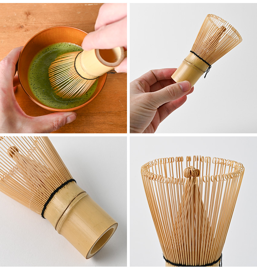 茶筅は抹茶だけでなく、きな粉ラテや粉末茶、和菓子作りにも使える“日本の泡立て器”。竹ならではのやさしい当たりで、素材の風味を損ないません。