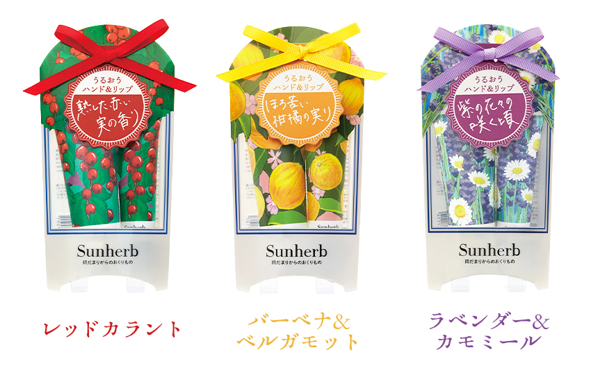 ハンドクリームとリップバームがセットになった「ハンド&リップ ケアセット」。 中身が見えるスタンドパッケージ入りで、リボンもついているのでギフトにもぴったりです。 ハンドクリームはこっくりとしたテクスチャーで、手肌にのばすとスッと馴染んでベタつかず、サラッとした使い心地。心地よい香りを愉しみながらしっかりと潤います。 チューブタイプのリップバームは唇に塗りやすく、少量でもなめらかに伸びます。目を惹くデザインと使い心地の良さで、外出先でもついつい使いたくなるリップクリームです。 フルーティーで甘酸っぱい「レッドカラント」、ほろ苦くさわやかな柑橘系の「バーベナ&ベルガモット」、ラベンダーやハーブが織りなす心落ち着く香りの「ラベンダー&カモミール」の3種類の香りからお選びいただけます。