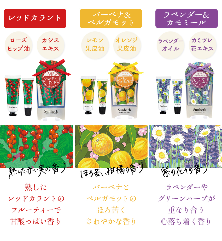 | | ▼ サイズ | パッケージ:150x77x厚み30 mm ハンドクリーム:98x40x厚み25 mm リップバーム:95x30x厚み20 mm | | ▼ 内容量 | ハンドクリーム:25ml リップバーム:10ml | | ▼ 成分 | <ハンドクリーム(レッドカラント)>水、セテアリルアルコール、シア脂、グリセリン、ワセリン、ジメチコン、パルミチン酸エチルヘキシル、ステアリン酸PEG-20、香料、フェノキシエタノール、ステアリン酸グリセリル、ステアリン酸PEG-100、(アクリル酸Na/アクリロイルジメチルタウリンNa)コポリマー、酢酸トコフェロール、乳酸桿菌/エリオジクチオンカリホルニクム発酵エキス、加水分解コメエキス、酒粕水、クロルフェネシン、ヒアルロン酸Na、パンテノール、ハチミツエキス、カニナバラ果実油、クロフサスグリ果実エキス <ハンドクリーム(バーベナ&ベルガモット)>水、セテアリルアルコール、シア脂、グリセリン、ワセリン、ジメチコン、パルミチン酸エチルヘキシル、ステアリン酸PEG-20、香料、フェノキシエタノール、ステアリン酸グリセリル、ステアリン酸PEG-100、(アクリル酸Na/アクリロイルジメチルタウリンNa)コポリマー、酢酸トコフェロール、乳酸桿菌/エリオジクチオンカリホルニクム発酵エキス、加水分解コメエキス、酒粕水、クロルフェネシン、ヒアルロン酸Na、パンテノール、ハチミツエキス、レモン果皮油、オレンジ果皮油 <ハンドクリーム(ラベンダー&カモミール)>水、セテアリルアルコール、シア脂、グリセリン、ワセリン、ジメチコン、パルミチン酸エチルヘキシル、ステアリン酸PEG-20、香料、フェノキシエタノール、ステアリン酸グリセリル、ステアリン酸PEG-100、(アクリル酸Na/アクリロイルジメチルタウリンNa)コポリマー、酢酸トコフェロール、乳酸桿菌/エリオジクチオンカリホルニクム発酵エキス、加水分解コメエキス、酒粕水、クロルフェネシン、ヒアルロン酸Na、パンテノール、ハチミツエキス、カミツレ花エキス、ラベンダー油 <リップバーム>ワセリン、ポリヒドロキシステアリン酸、キャンデリラロウ、酢酸トコフェロール、ベヘン酸グリセリル、オクタステアリン酸ポリグリセリル-6、アマナズナ種子油、アーモンド油、香料、シア脂 | | ▼ セット内容 | | ハンドクリーム、リップバーム 各1点 ※リボン付きパッケージ入り | | ▼ 注意事項 | 熨斗対応不可商品です。 高温多湿・直射日光を避けて保管してください。 以下の点がみられる場合がございますが、運搬・製造工程上避けられないものとなりますので予めご了承願います。 多少の傷や擦れ/箱のつぶれや傷・サイズ/重さ/色合い等の若干の違い 【メール便利用時の注意点】 メール便輸送中に傷や箱つぶれ等が発生する可能性がございます。 メール便配送は、輸送時の破損/紛失/未着などを含め製品の保証がございませんので、ご了承の上でのご利用をお願いするとともに、宅配便配送の利用をおすすめいたします。