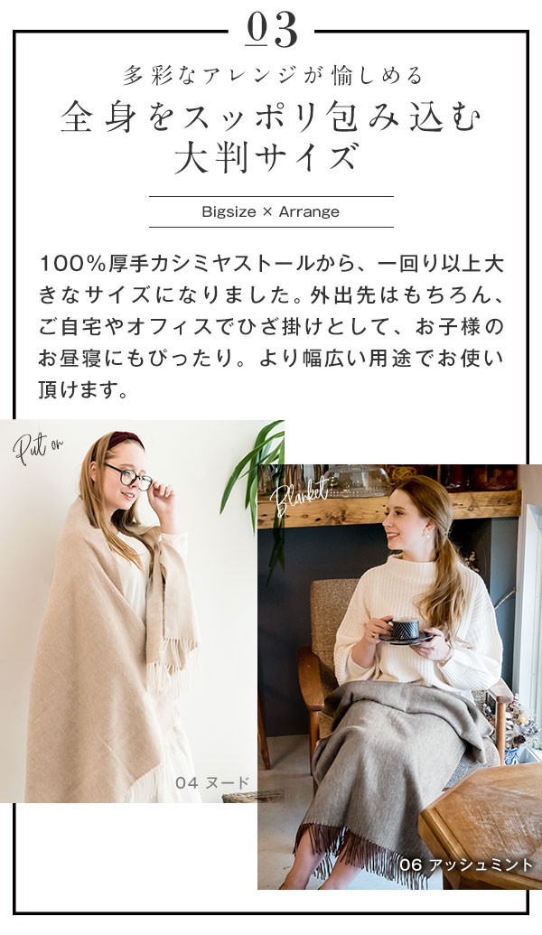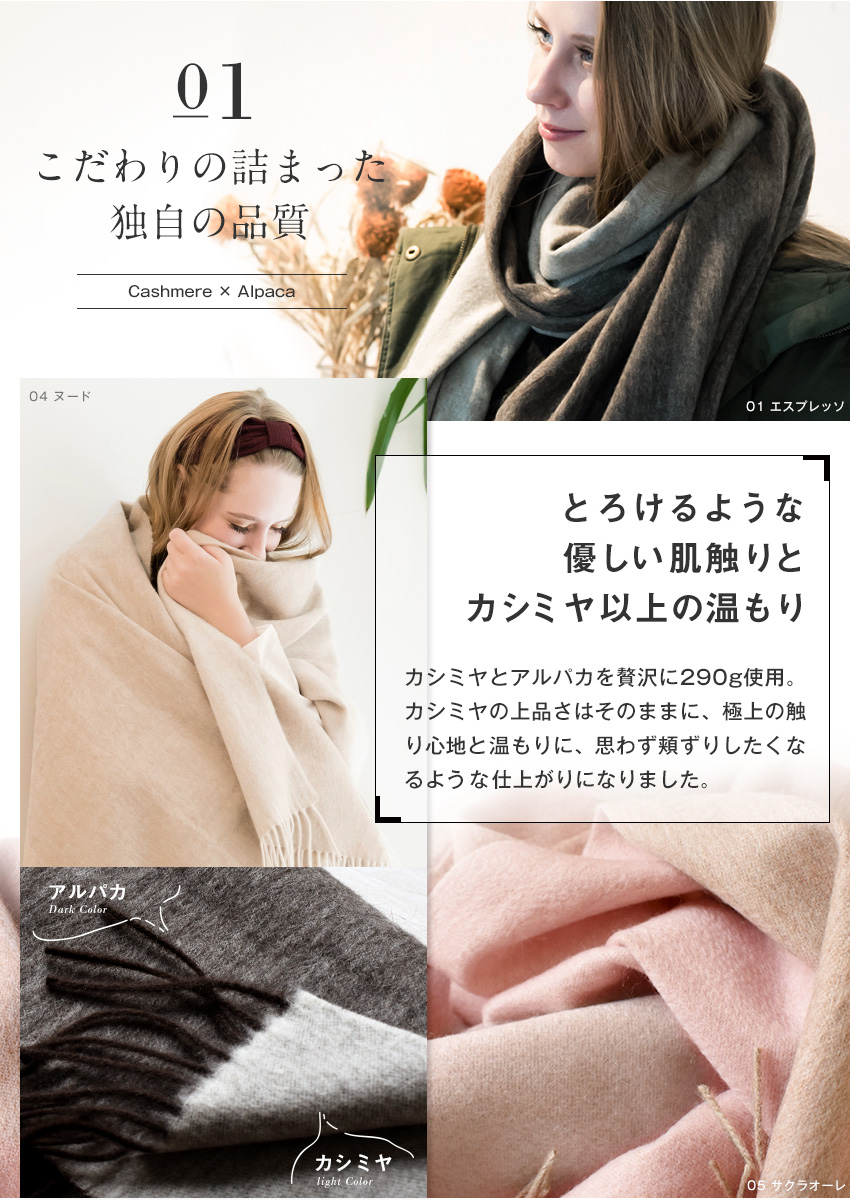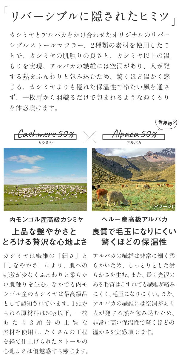 リバーシブルデザインはコーディネートやアレンジのしやすさだけでなく、2種類の素材を使用したことで、カシミヤの肌触りの良さと、カシミヤ以上の温もりを実現させた「カシミヤ×アルパカ リバーシブルマフラー」。