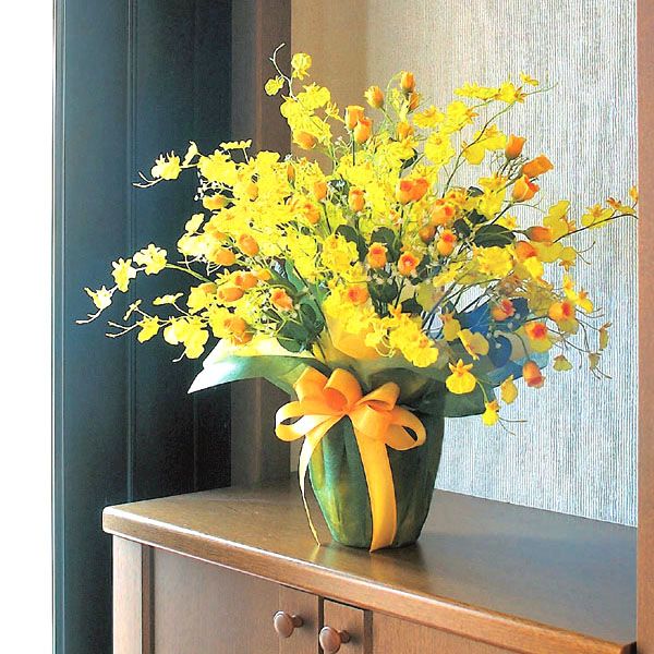 〔オンシジューム&小さなイエローローズ・カスミソウのアレンジメント〕