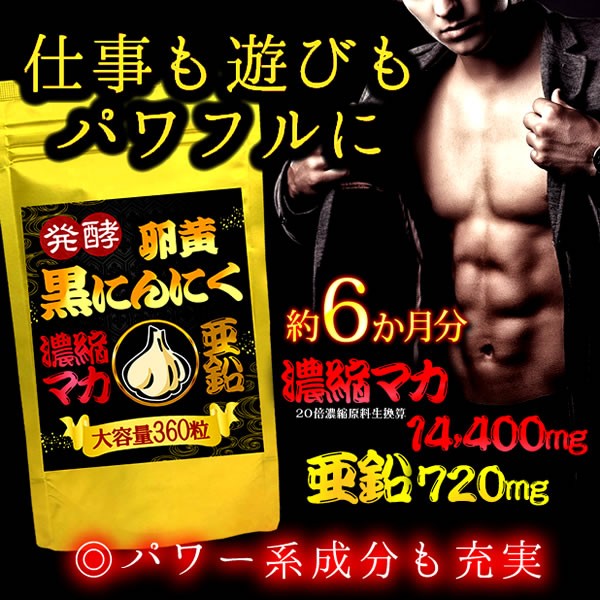 | 【大容量約6か月分】仕事もプライベートも精力的に頑張る方に♪発酵黒にんにく卵黄に濃縮マカ、亜鉛、セサミン、高麗人参、黒五穀、黒酢などエネルギッシュな成分をギュッと凝縮♪【発酵黒にんにく:ホワイト六片にんにく(青森県産)を使用】大容量360粒だからたっぷり約6か月分! ≪商品のポイント≫ 昼はアクティブ、夜はパワフルに!毎日を精力的に過ごしたい方。年齢が気になり始めた。そんな方におすすめなのが、滋養成分の宝庫で国産有名ブランドのホワイト六片にんにくを丹念に熟成・発酵した「発酵黒ニンニク卵黄」と精力的に頑張る方から人気の「濃縮マカ」、そして不足しがちと言われる元気ミネラル「亜鉛」をしっかり配合したサプリメントの登場です♪ |